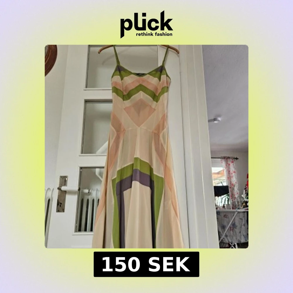 Snygg långklänning med geometriskt mönster i beige, grönt och lila. Klänningen har smala axelband och en flytande passform som ger en elegant look. Perfekt för sommarens alla tillfällen. S men passar också M. Aldrig använd