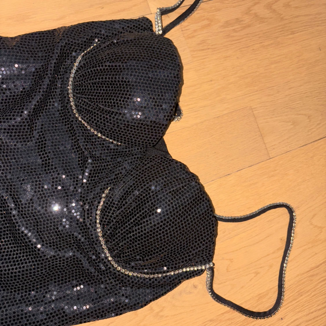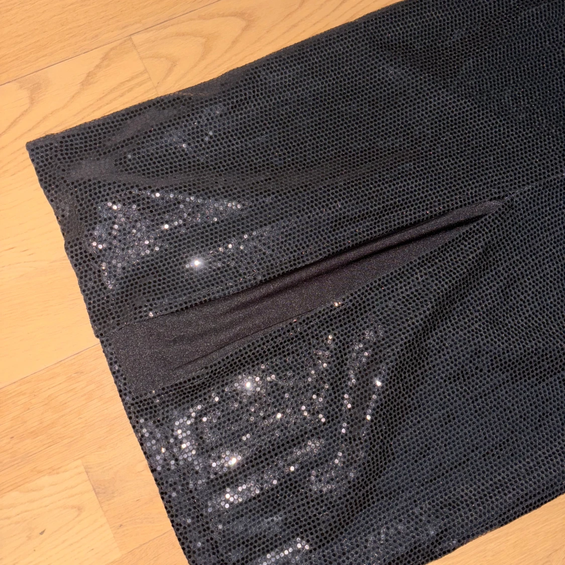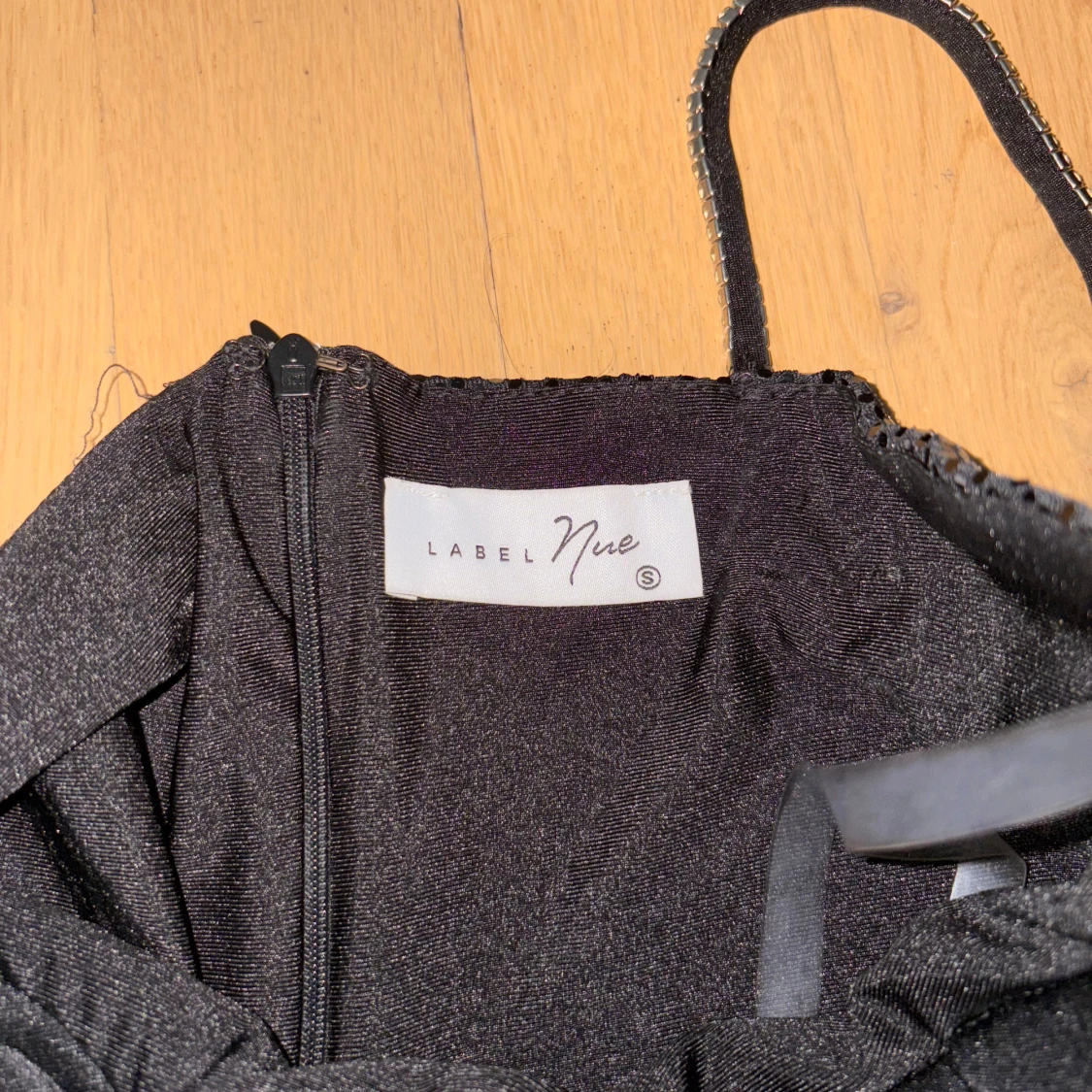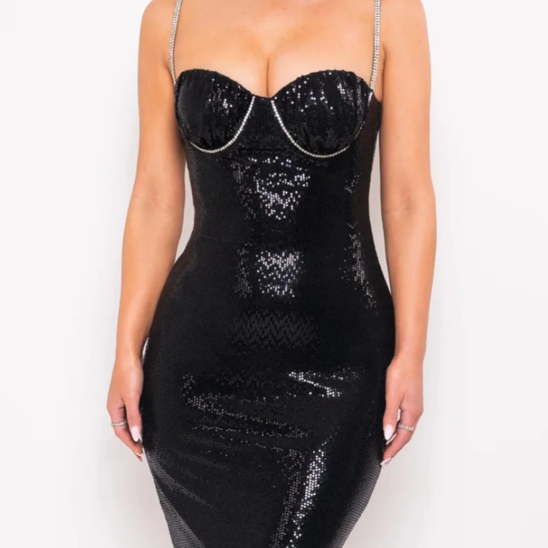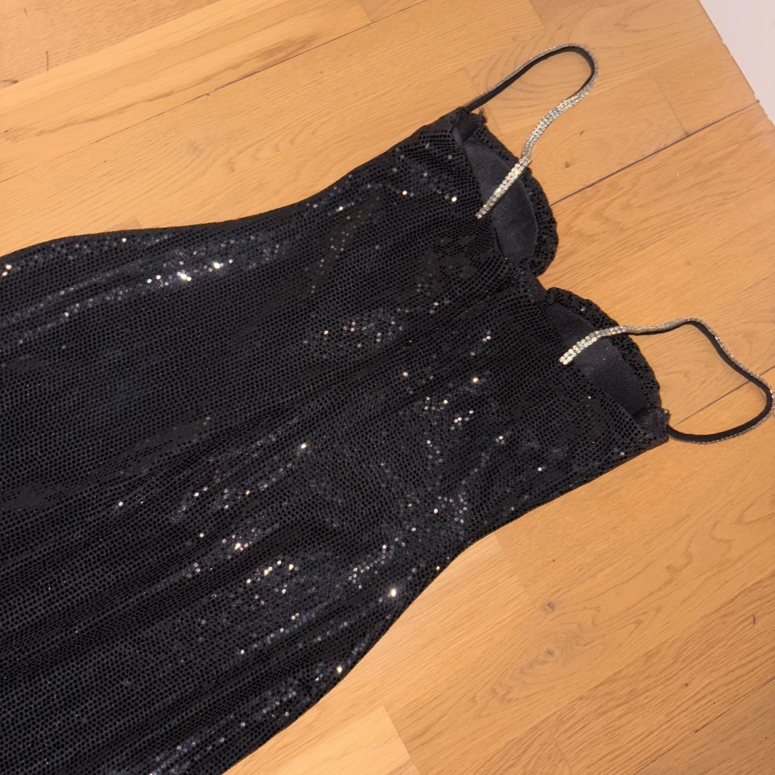Supersnygg svart långklänning från Label Nue med glittriga paljetter över hela klänningen. Den har smala axelband med strassdetaljer, markerad byst och en slits framtill. Klänningen är figurnära och har dragkedja i ryggen. Perfekt för dig som vill sticka ut.