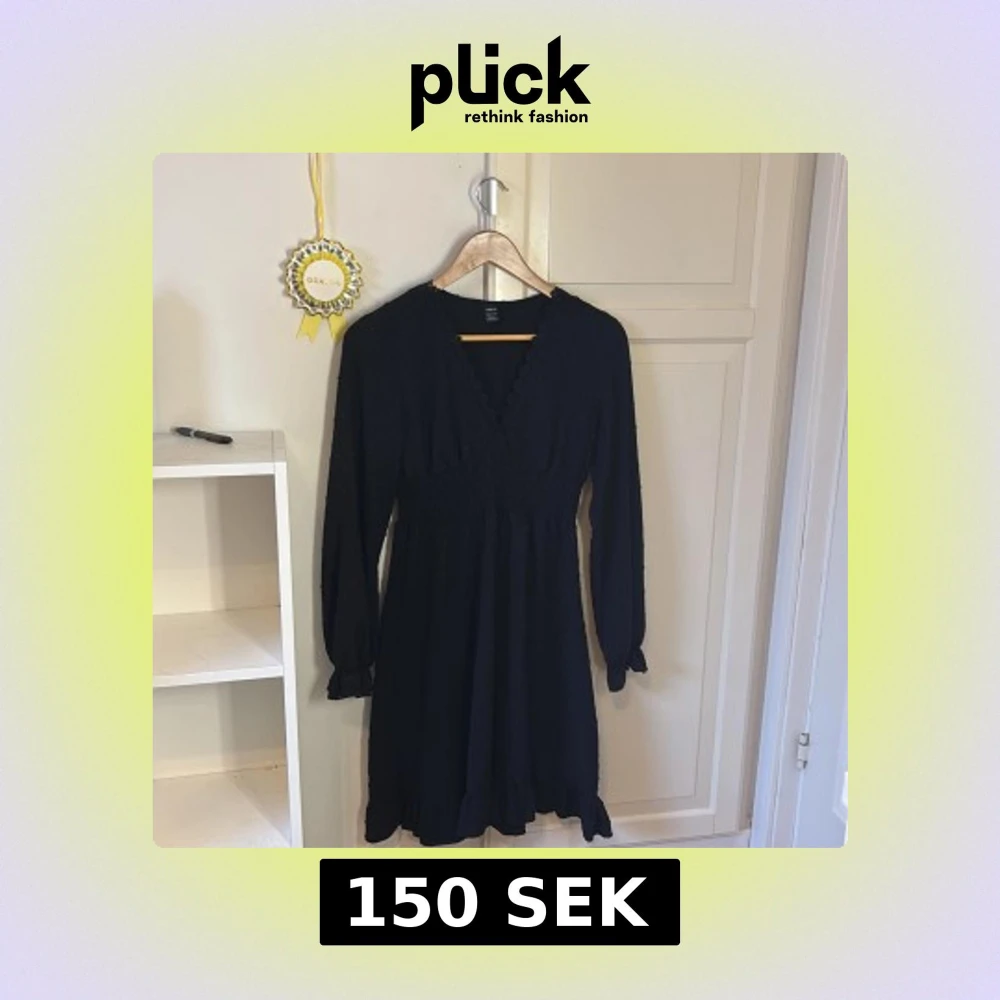 Svart kortklänning från SHEIN med lång ärm, v-ringning med spetskant och smockad midja. Tunt tyg med diskret prickigt mönster och volangdetalj nertill. Perfekt för dig som gillar en feminin och stilren look.