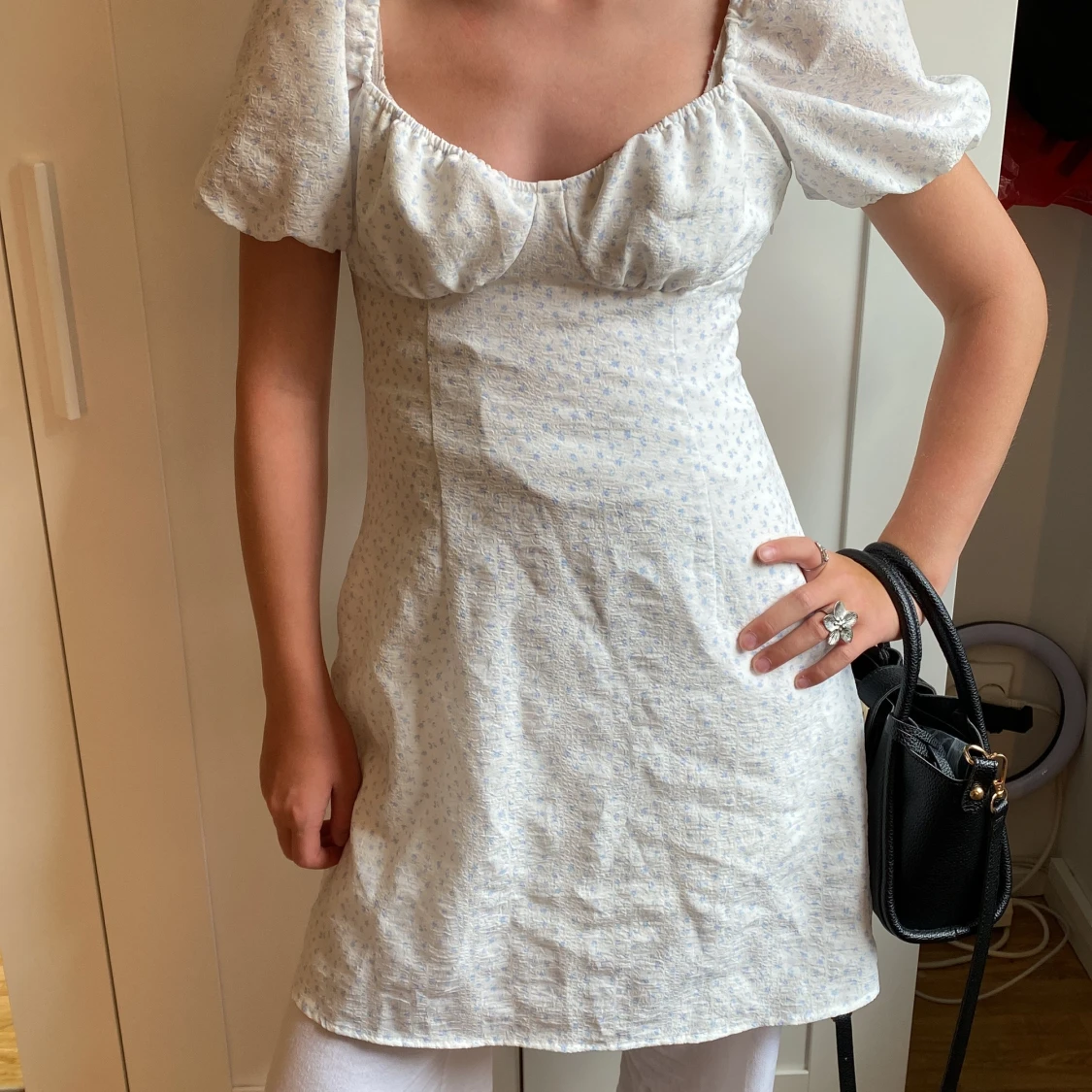 Supersöt vit kortklänning med ljusblått blommönster från H&M Divided. Använd 1 gång🩷storlek s🩷