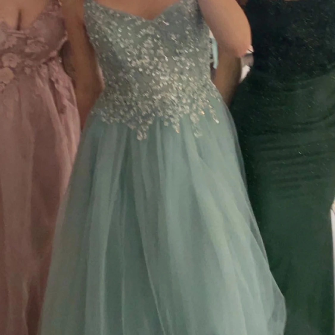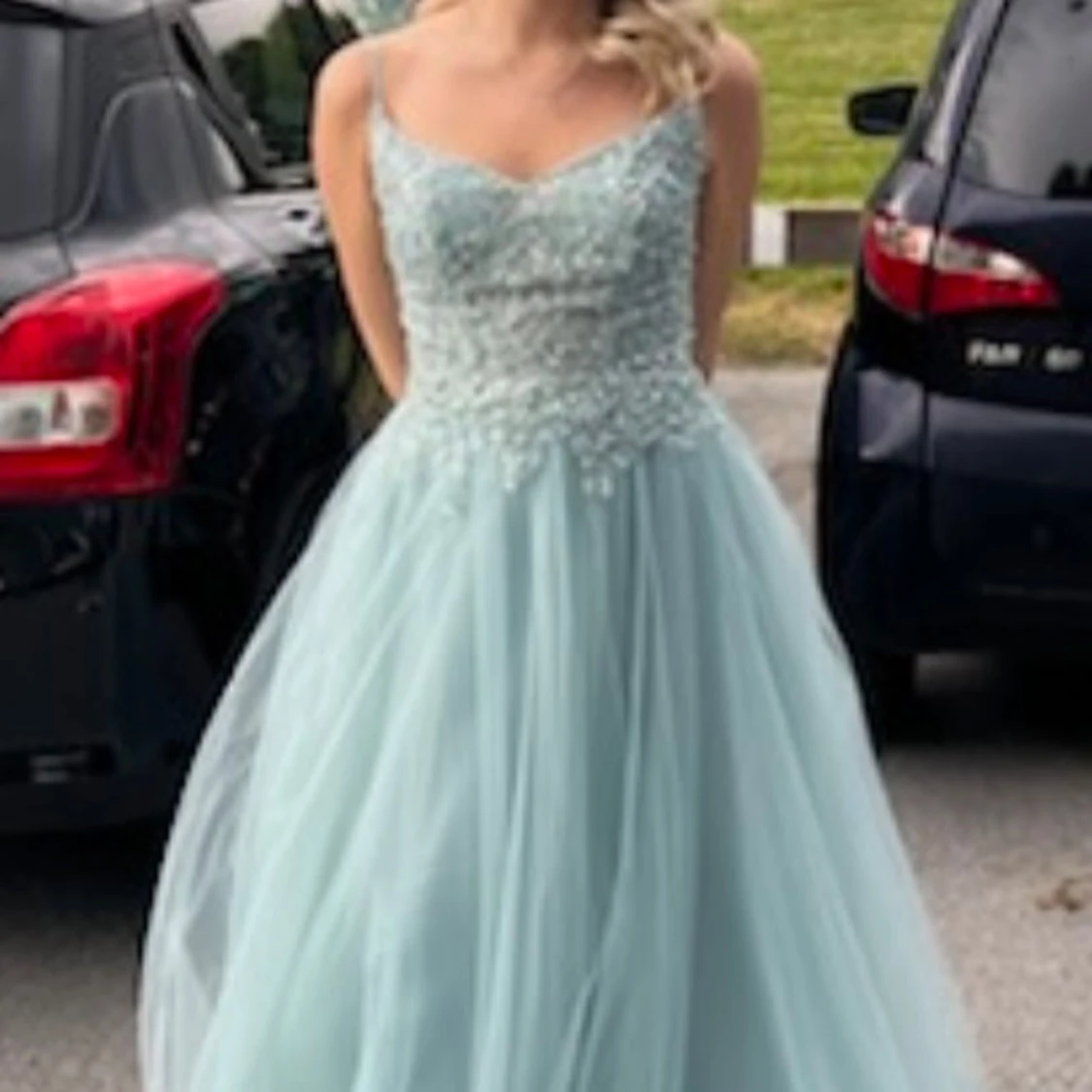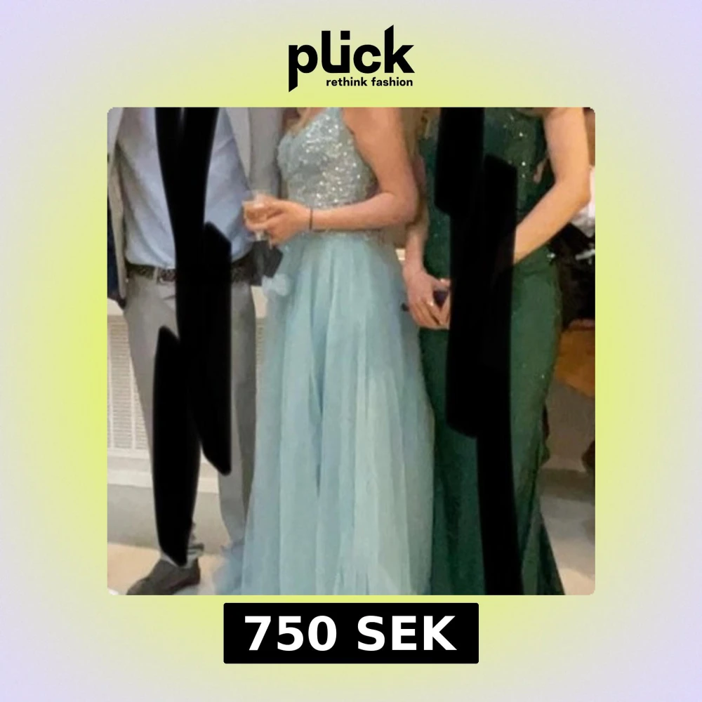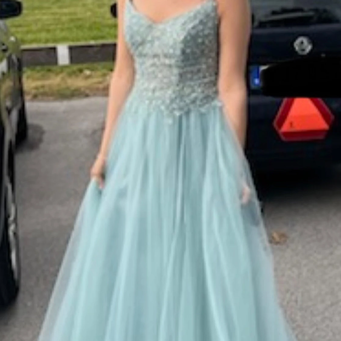 ljusblå långklänning med glittrande paljetter på överdelen. Klänningen har en v-ringad design vilket ger en stilren och festlig look. Perfekt för bal eller andra speciella tillfällen. Köpt för 1150kr