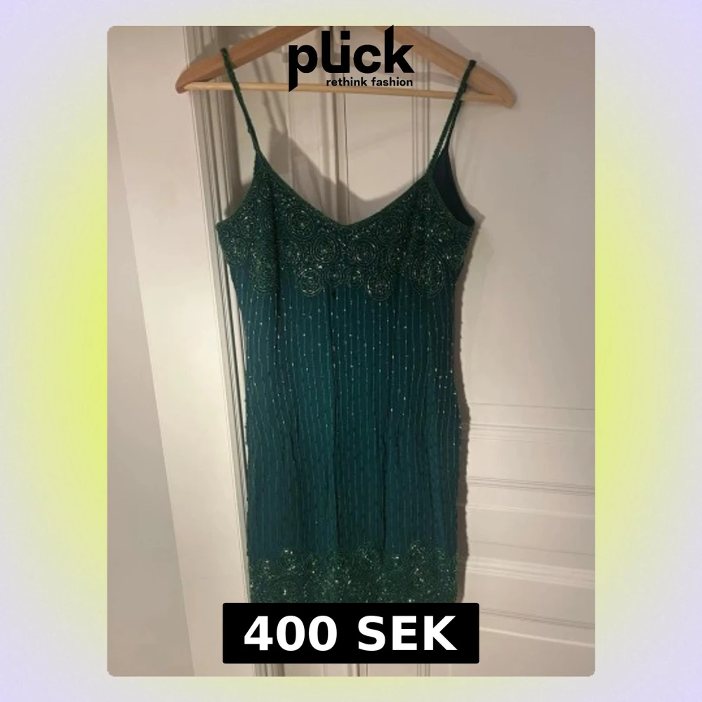 Supersnygg grön kortklänning från Castelbajac med tunna axelband och detaljerat pärlbroderi i cirkelmönster upptill och nedtill. Klänningen har smal passform och är täckt av små pärlor som ger en glittrig effekt.