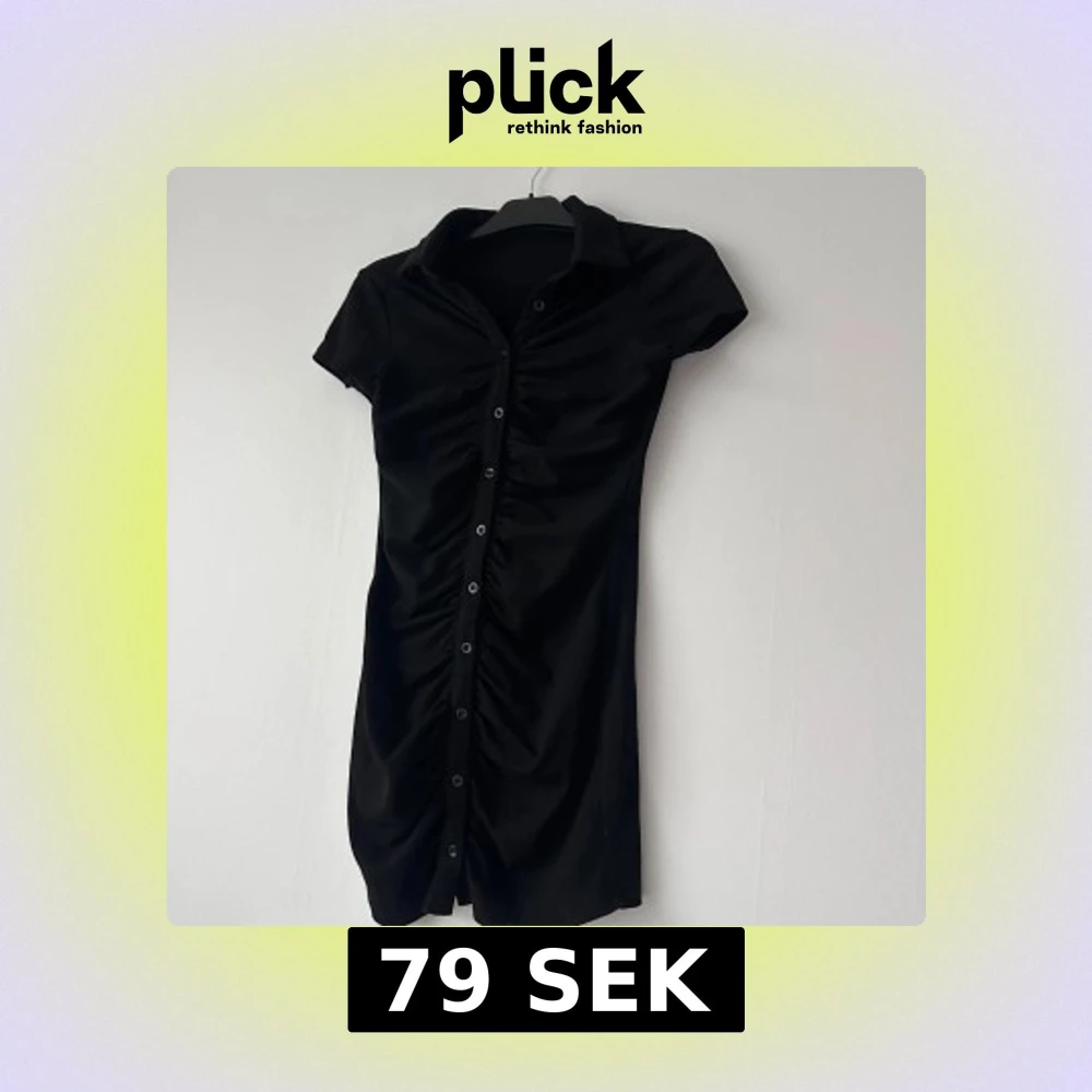 Säljer en svart skjortklänning med korta ärmar och knappar längs hela framsidan. Klänningen har en krage och lätt rynkade detaljer längs knappraden för en snygg passform. Perfekt för dig som gillar stilrena och enkla plagg.