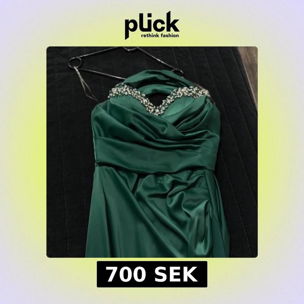 Säljer en elegant grön långklänning med vacker drapering och pärldetaljer längs halsringningen. Klänningen har en omlottliknande överdel och är perfekt för speciella tillfällen.