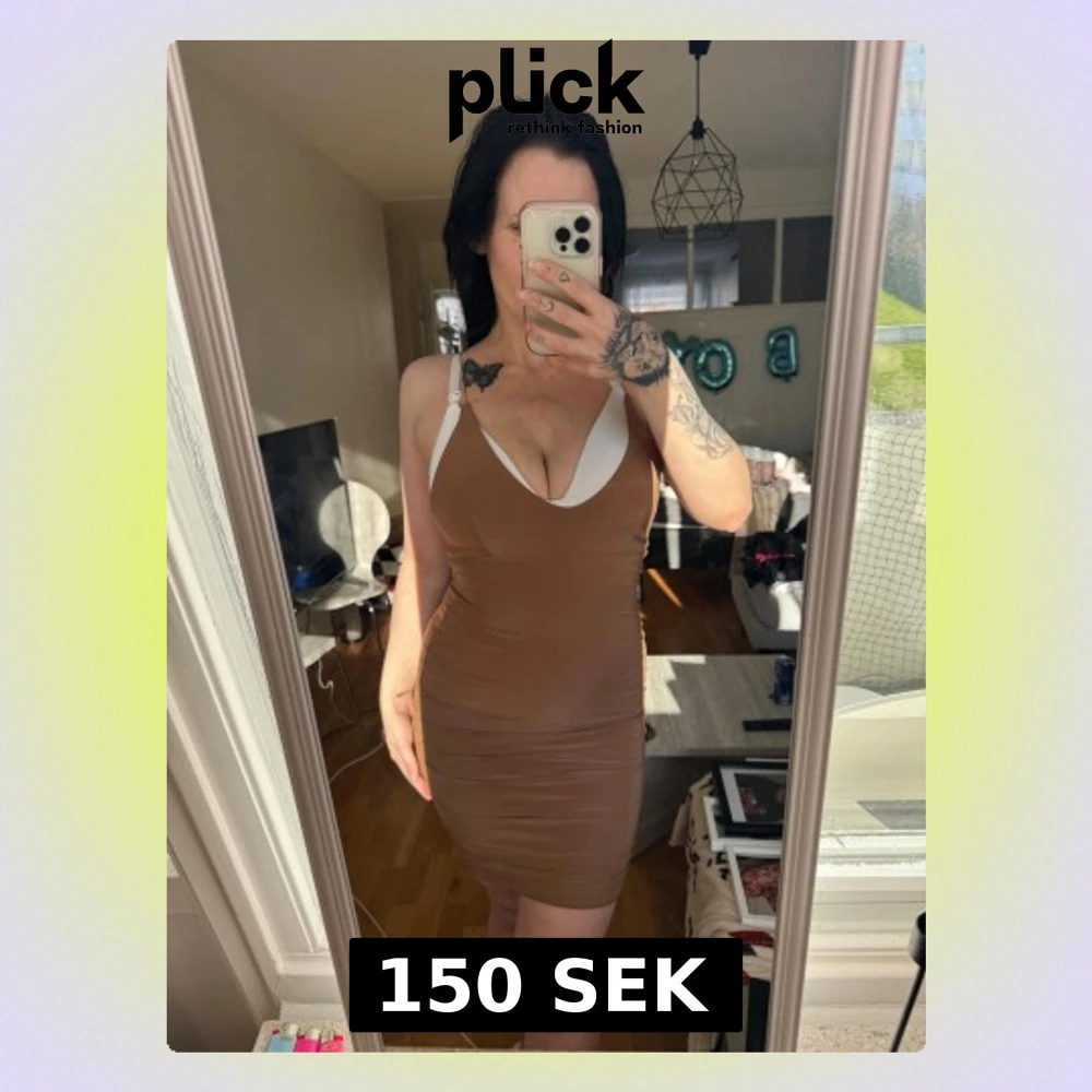 Stretchig och figurnära klänning med tunna axelband och låg rygg. Färgen är mörkbeige/brun, nästan guldaktig. ✨ Rebecca Stella
