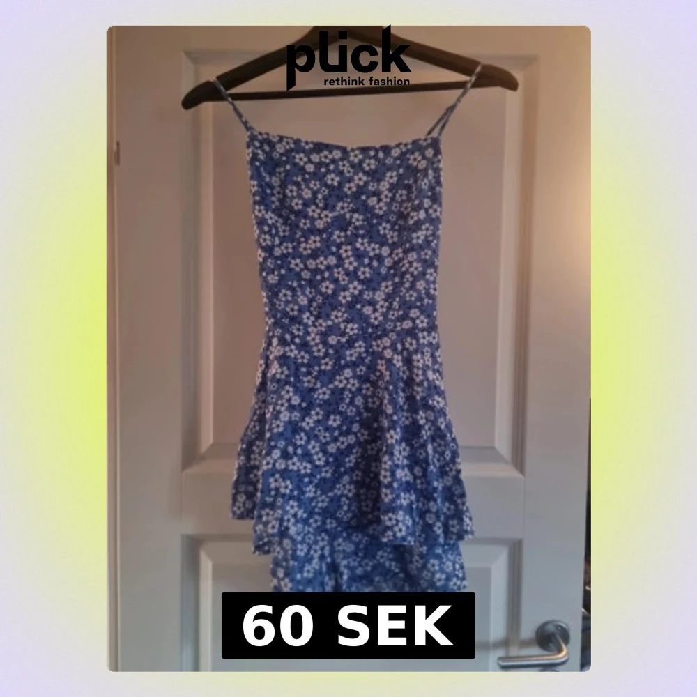 Supersöt blå kortklänning med vita blommor och tunna axelband. Klänningen har volangig kjol, öppen rygg med knyt och omlott-detalj baktill. Perfekt för varma dagar och ger en riktigt somrig vibe.