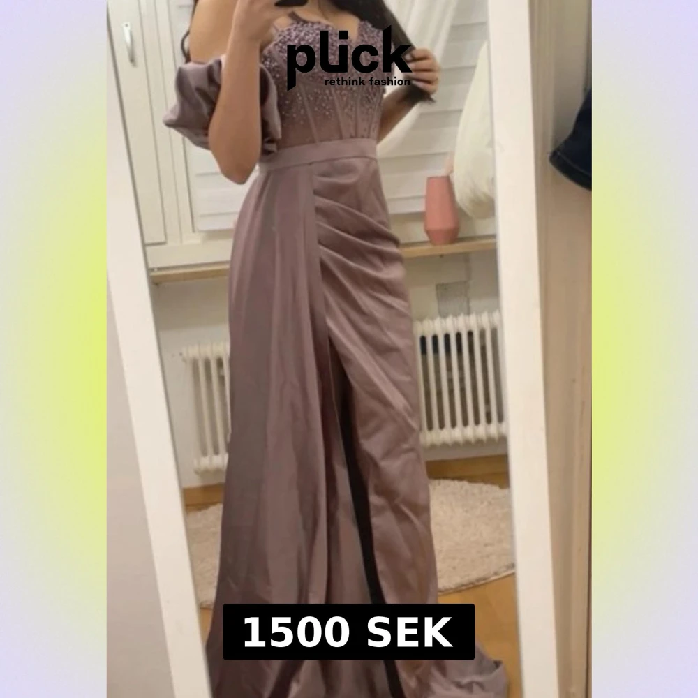 Elegant långklänning i lila med markerad midja och snygg slits framtill. Klänningen har korta puffärmar och ett lätt glansigt tyg som ger en lyxig känsla. Perfekt för bal eller festliga tillfällen.
