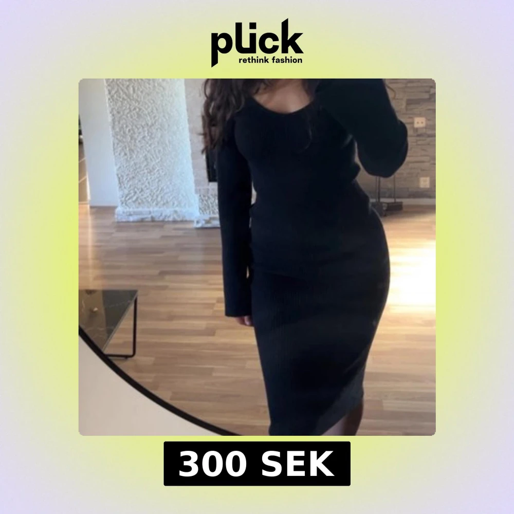 Säljer en svart, ribbad klänning med lång ärm och figurnära passform. Klänningen har en rundad urringning och är i midi-längd, perfekt för dig som gillar en stilren och enkel look. Materialet är stretchigt och bekvämt.