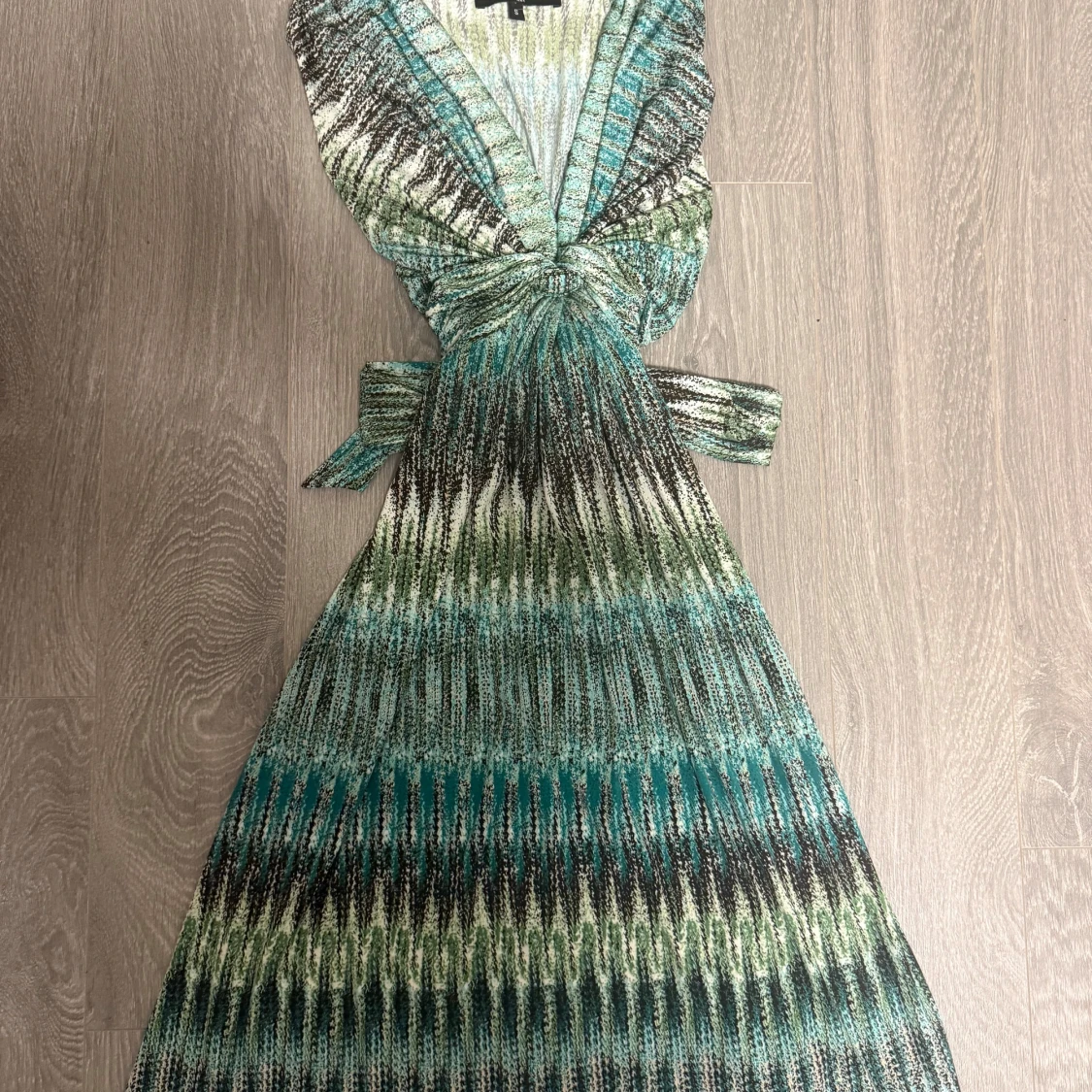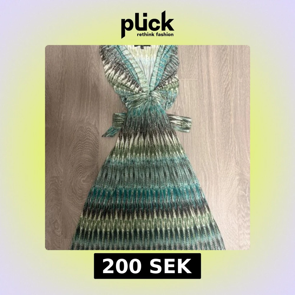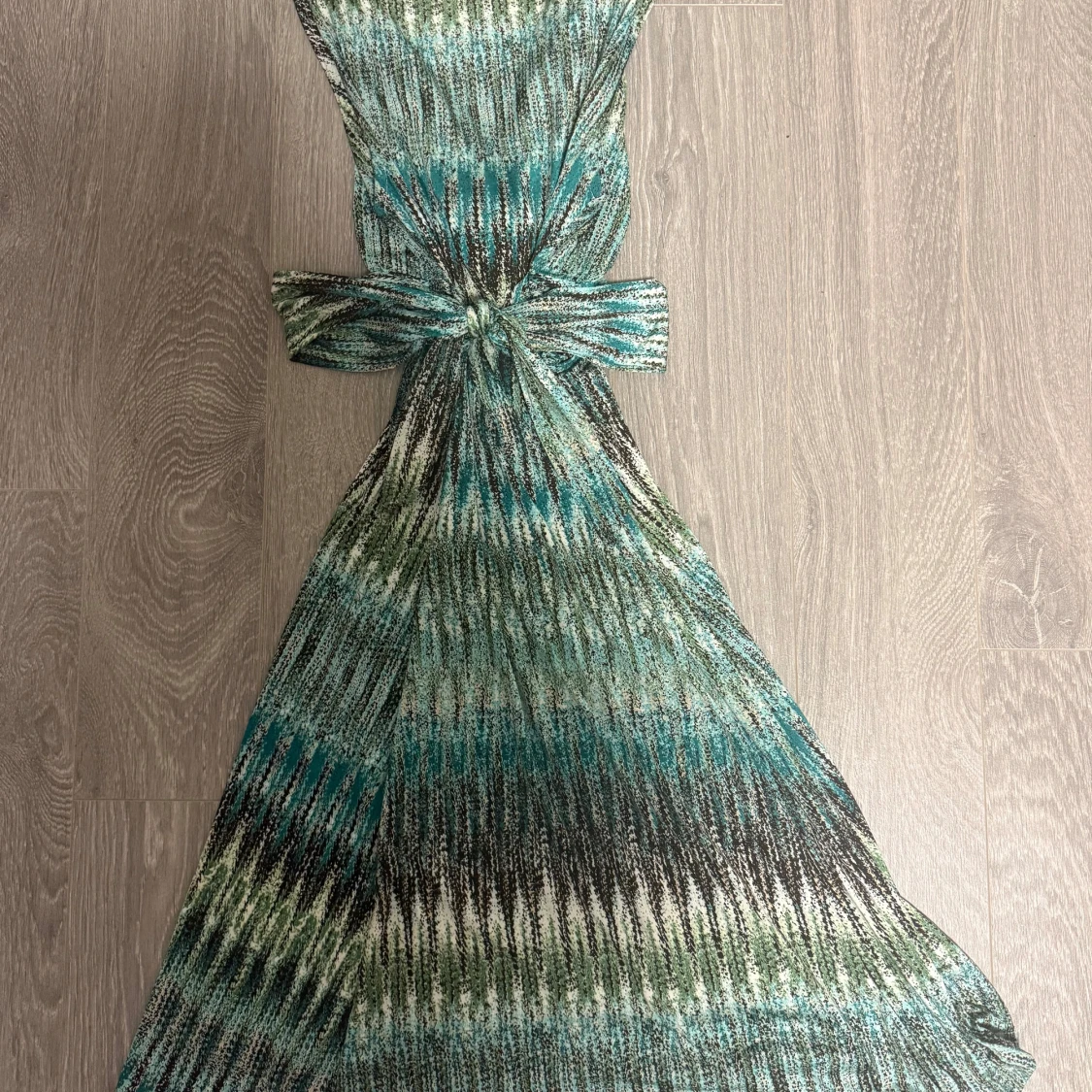 Supersnygg långklänning från Ilse Jacobsen i gröna, blå och svarta toner med randigt mönster. Klänningen har omlottmodell med v-ringning och knytband i midjan. Perfekt för dig som gillar unika mönster och bekväm passform.