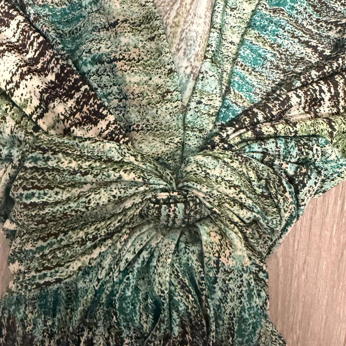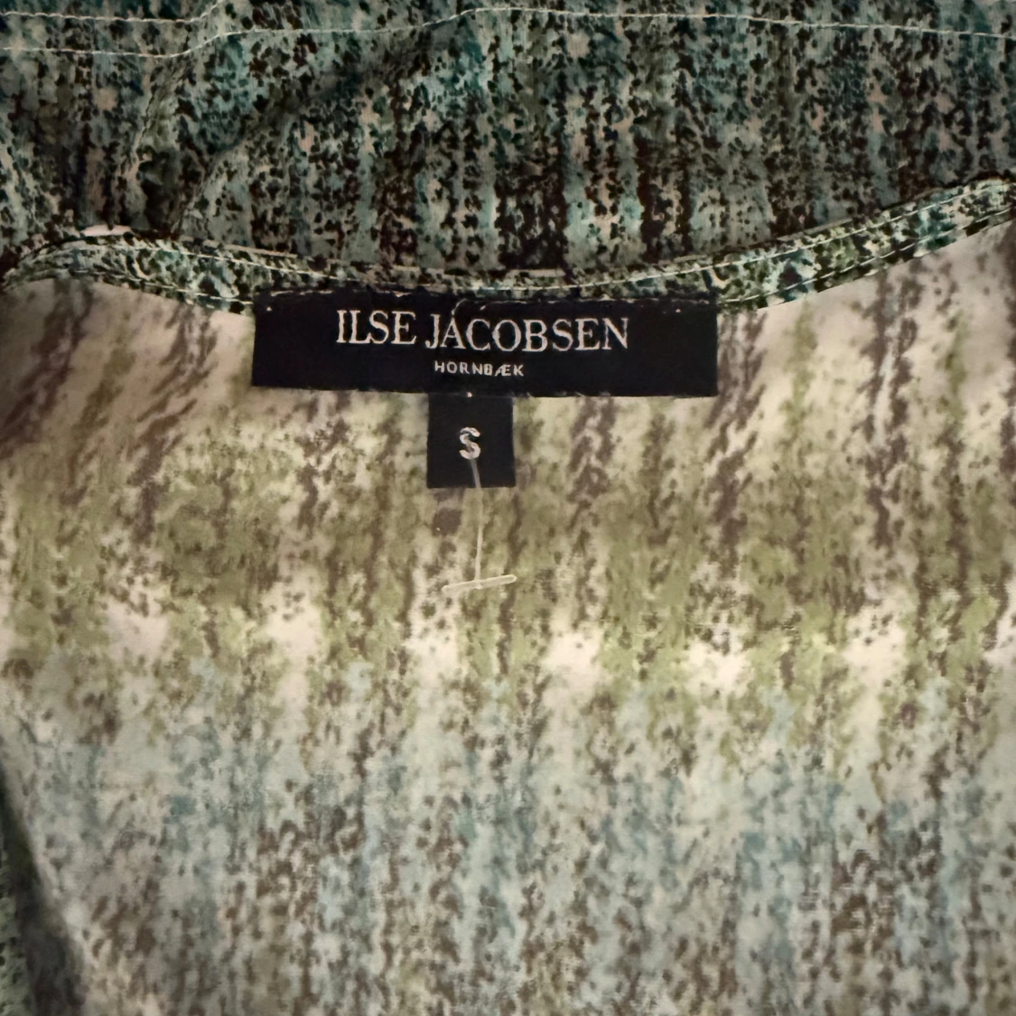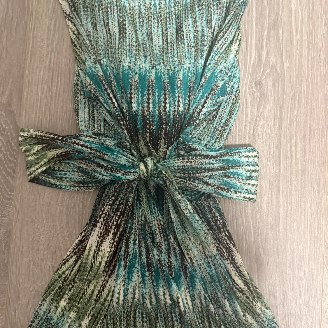 Supersnygg långklänning från Ilse Jacobsen i gröna, blå och svarta toner med randigt mönster. Klänningen har omlottmodell med v-ringning och knytband i midjan. Perfekt för dig som gillar unika mönster och bekväm passform.