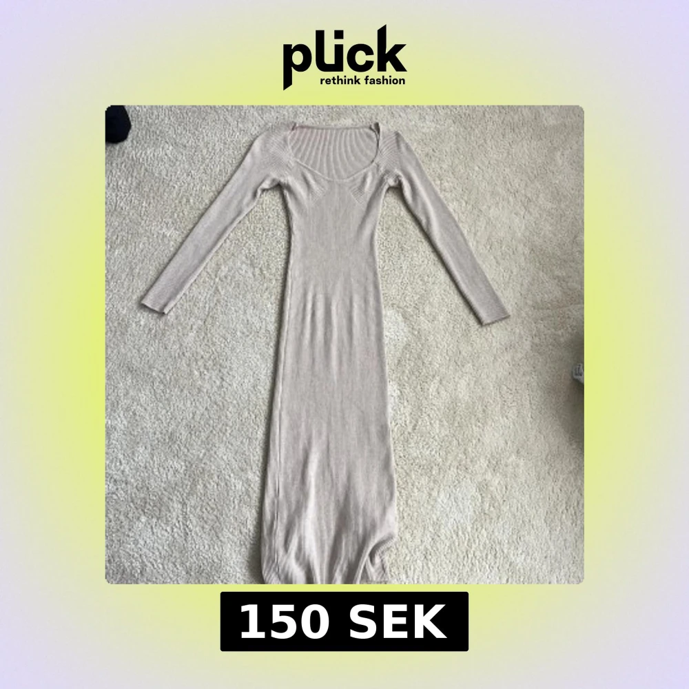 Supersnygg beige ribbad långklänning med lång ärm och rundad urringning. Klänningen har en tight passform och en slits bak. Står inte storlek men skulle gissa på xs-s