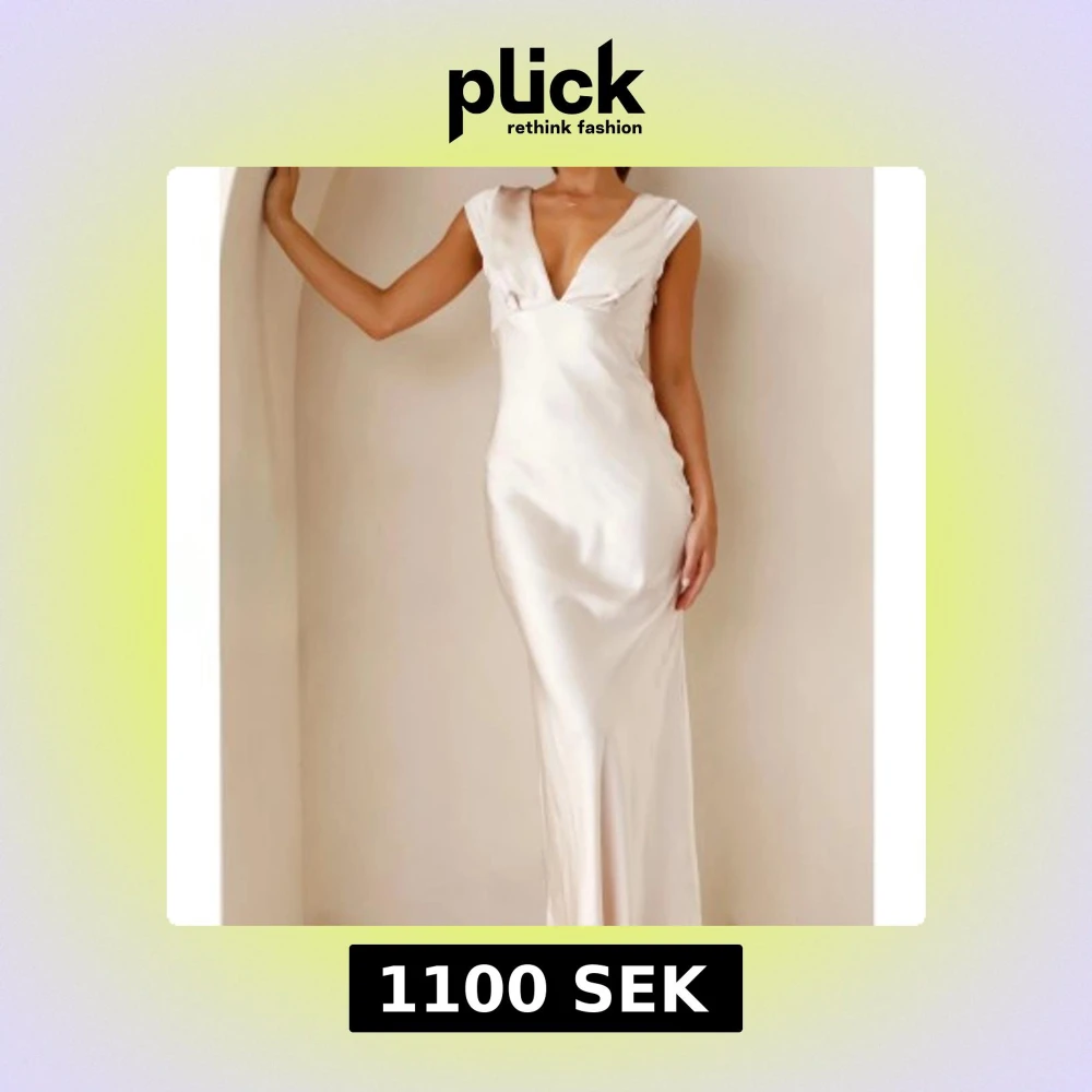 Elegant champagnefärgad långklänning i satin med djup v-ringning och öppen rygg. Klänningen har en figurnära passform och korta ärmar. Perfekt för festliga tillfällen.
