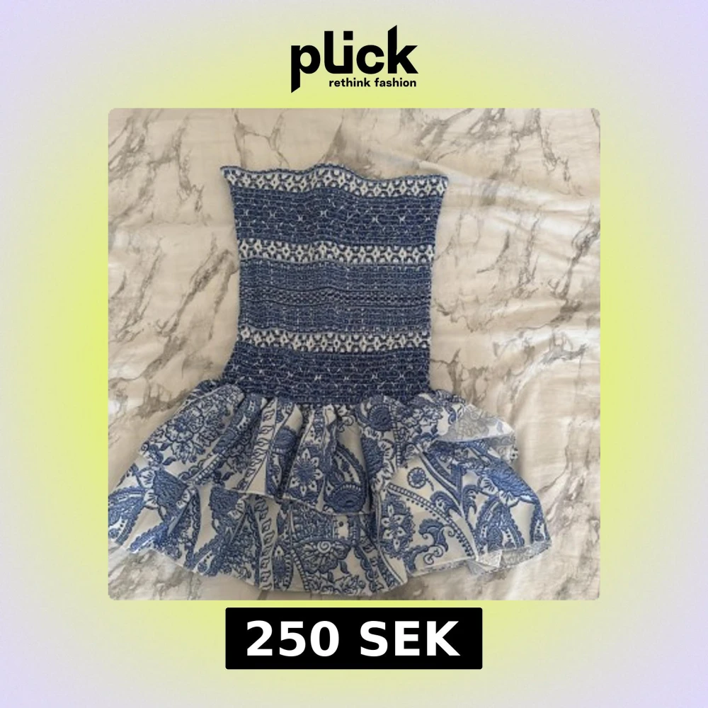 Supersöt blåvit kortklänning med smockad överdel och bred volang nedtill. Klänningen har ett detaljerat blommigt mönster och är axelbandslös, perfekt för varma dagar. Materialet känns lätt och luftigt, vilket gör den skön att bära under sommaren. Köpta utomlands❣️❣️