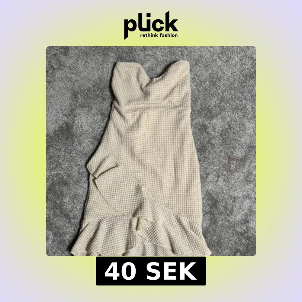 Snygg beige axelbandslös klänning med volangdetaljer. Perfekt för en stilren look med en twist. Materialet har en texturerad yta som ger en unik känsla.
