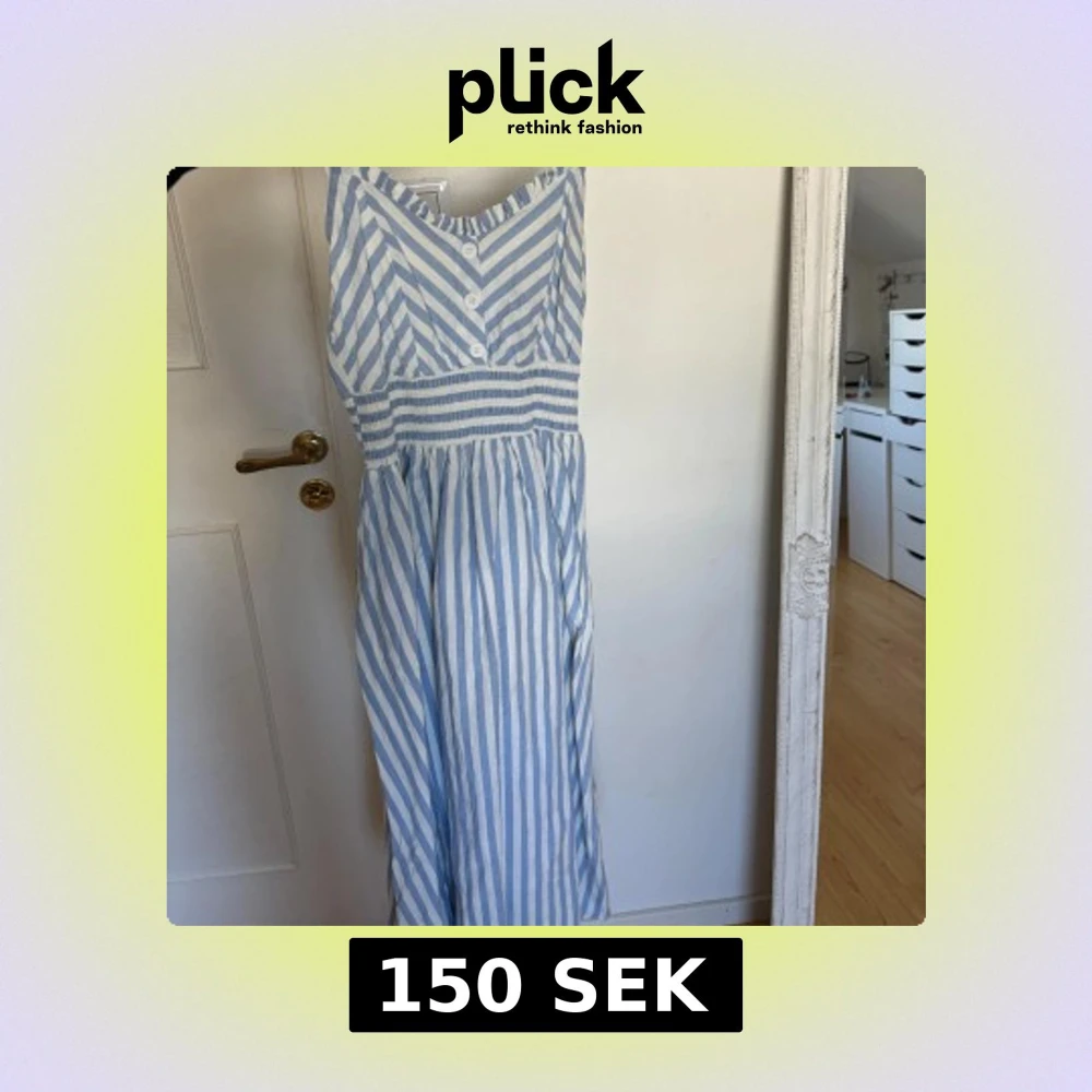 Säljer en blåvit långklänning med smock i midjan och knappar framtill. Klänningen är ärmlös och har ett klassiskt randigt mönster.