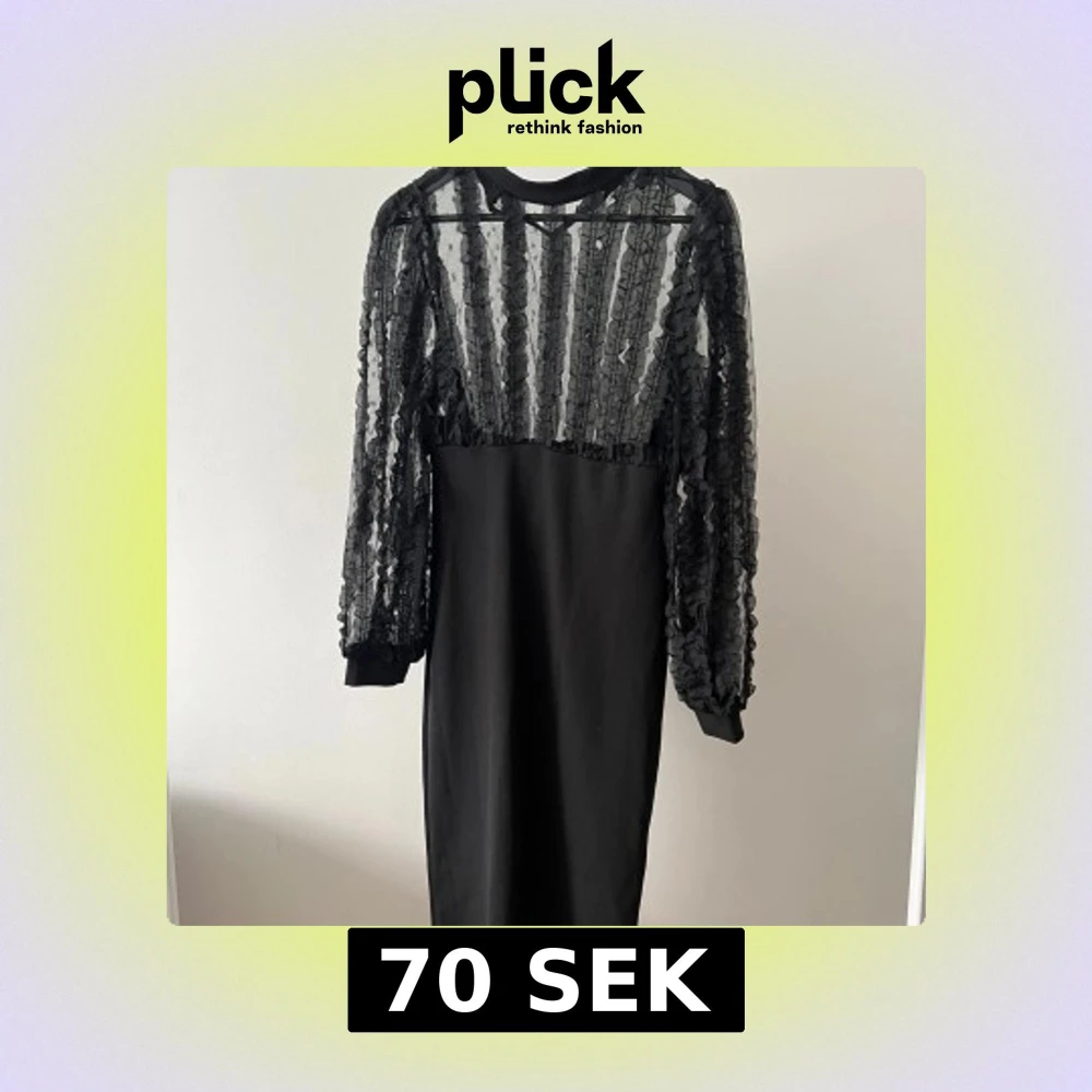 Säljer en svart långklänning med transparent mesh och volangdetaljer på överdelen och ärmarna. Klänningen har långa ärmar och en hög halsringning. Perfekt för dig som vill sticka ut med en elegant och unik look. Några lösa trådar därav priset.