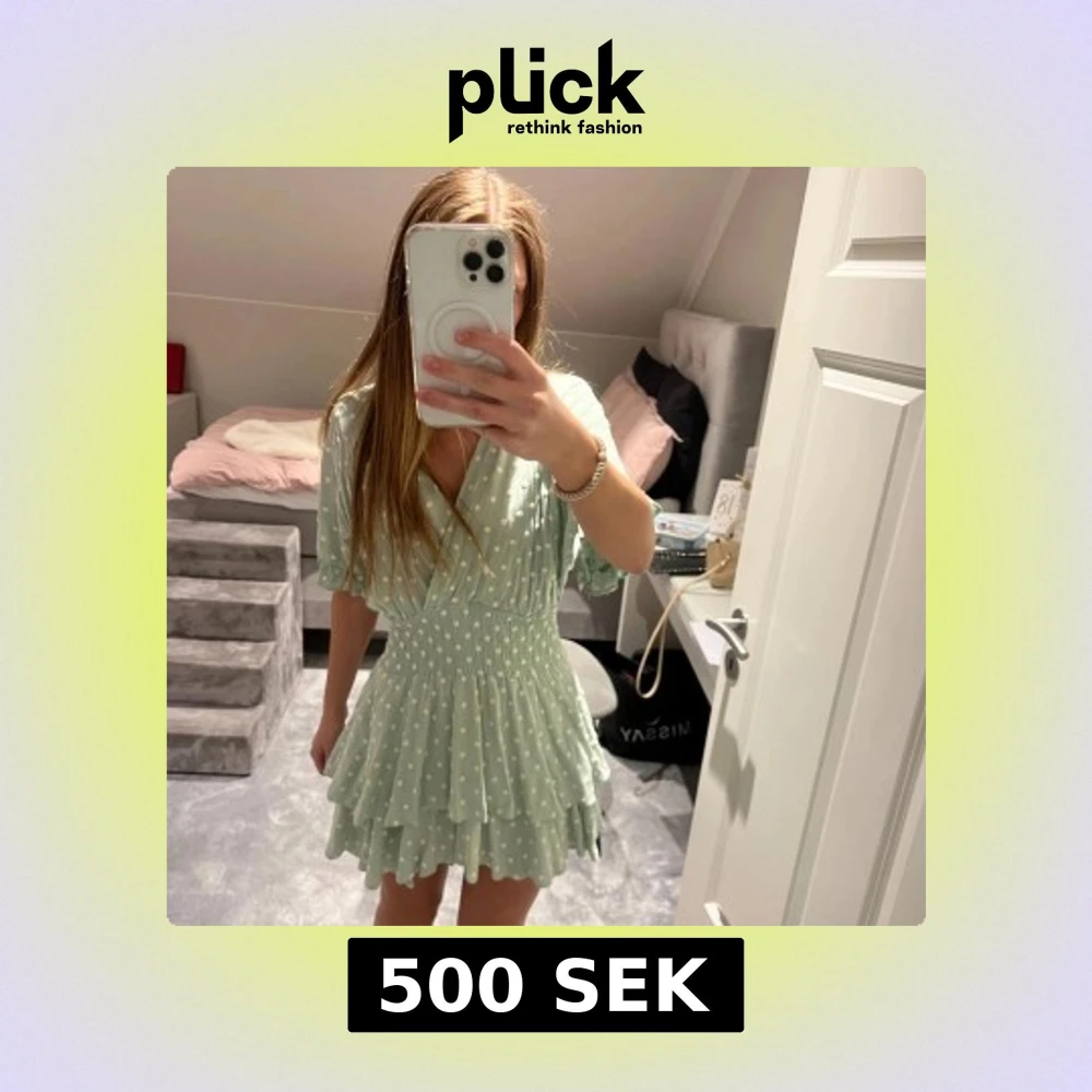 Superfin ljusgrön klänning med vita prickar från Zara. Klänningen har korta ärmar, v-ringning och volangdetaljer i kjolen. Perfekt för vår och sommar och skolavslutningar! Bilderna är lånade💗