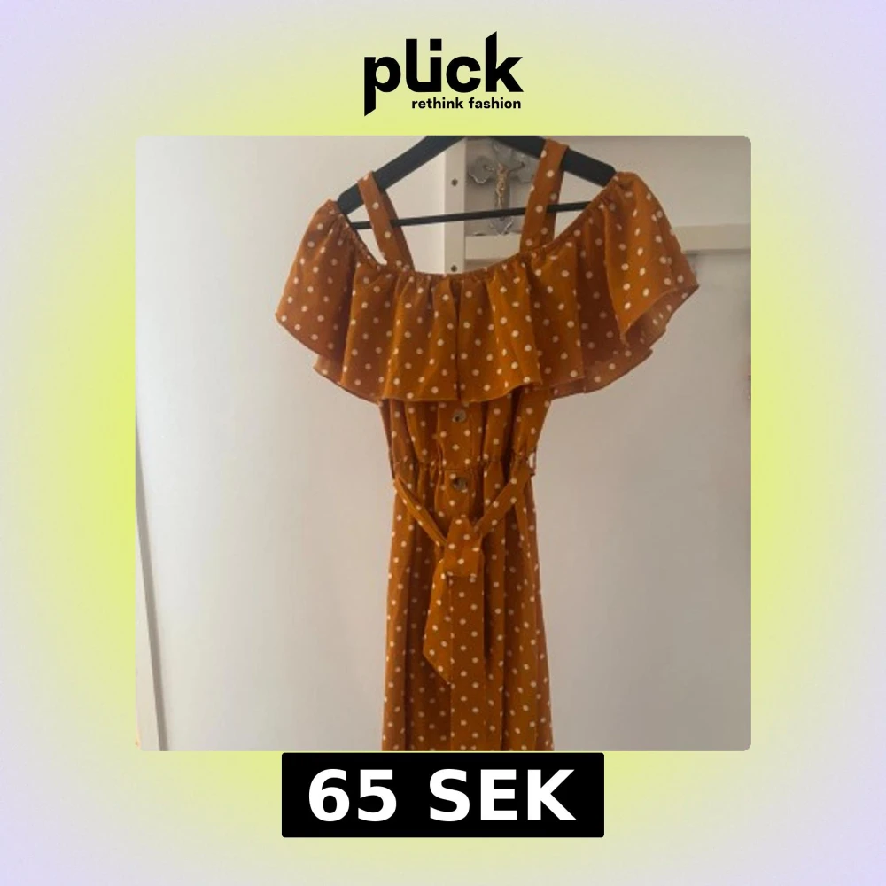 Superfin långklänning i orange med vita prickar, volang upptill och axelband. Klänningen har knappar framtill, markerad midja med knytband och är perfekt för sommarens alla tillfällen. Lätt och luftig känsla.