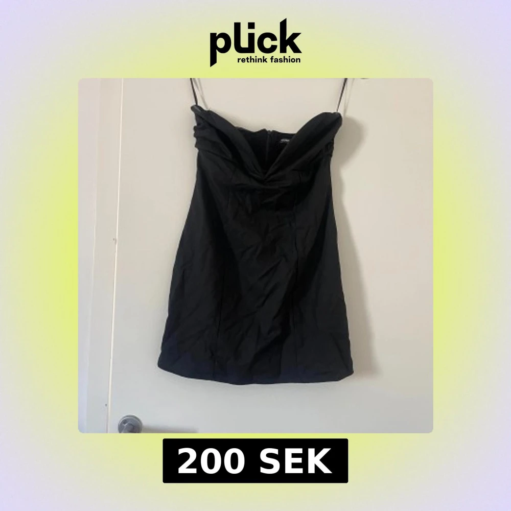 Snygg svart axelbandslös klänning. Perfekt för en elegant kvällslook. Klänningen har en draperad detalj framtill som ger en stilren touch.