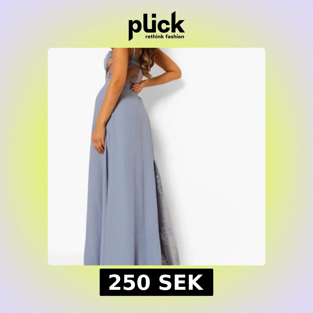 Supersnygg ljusblå långklänning med tunna axelband och transparenta partier i mesh med broderade blommor på sidorna. Klänningen har en figurnära överdel med v-ringning och en flowy kjol som ger en elegant look.