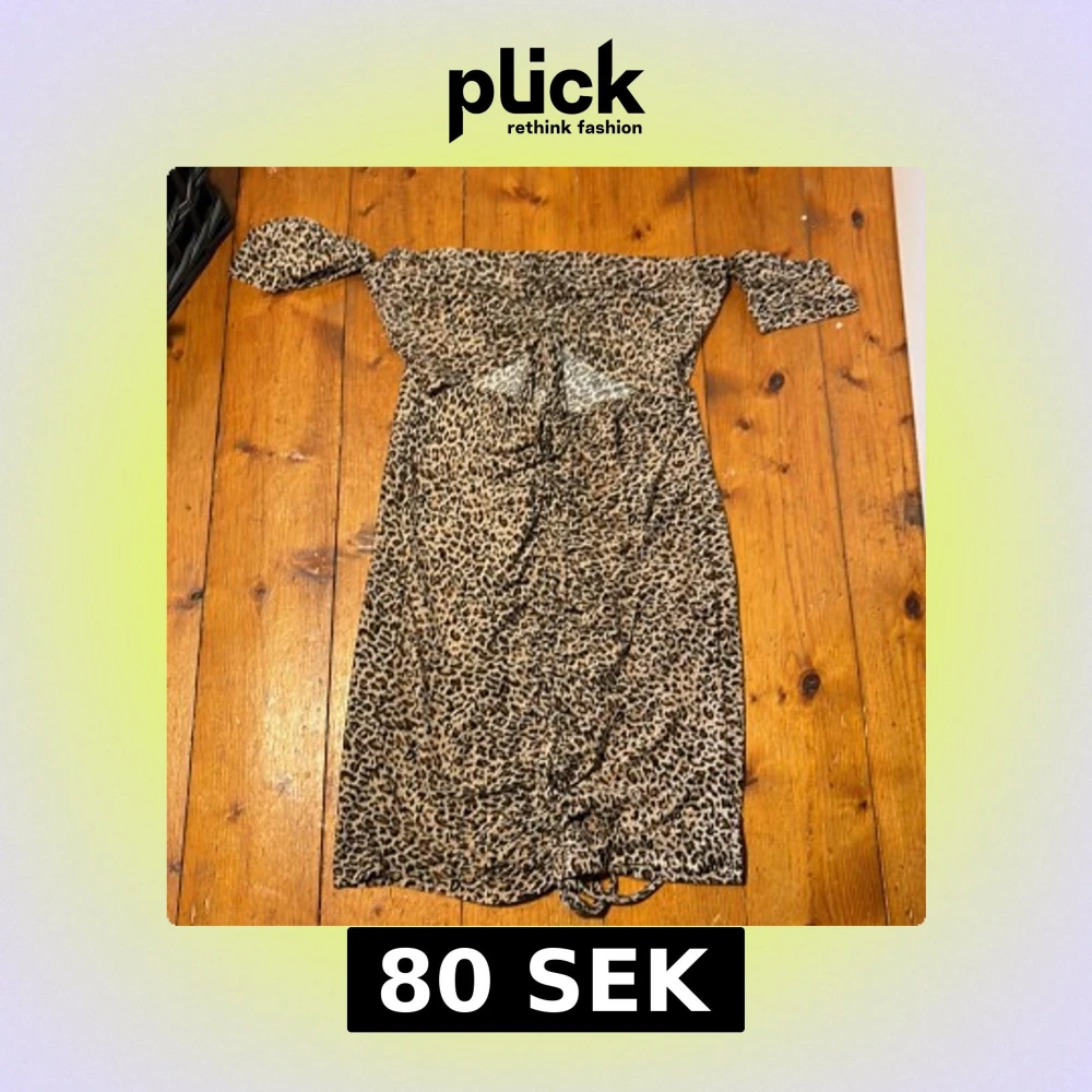 Snygg kort offshoulder klänning med leopardmönster och knytband upptill. Klänningen har en tight passform och är i mjukt, stretchigt material. Passar xs och s skulle jag säga