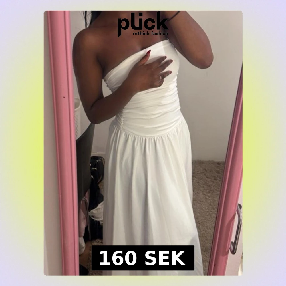 Elegant vit långklänning med axelbandslös design och rynkade detaljer upptill. Klänningen har en figurnära passform upptill och faller mjukt från midjan. Perfekt för speciella tillfällen och sommarens fester.