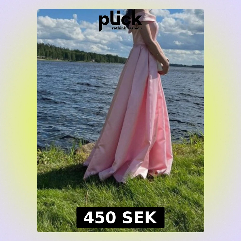 Elegant ljusrosa balklänning med offshoulder-design och vid, golvlång kjol. Klänningen har en klassisk, figurnära överdel och är tillverkad i ett glansigt material som ger en lyxig känsla. Perfekt för bal eller student.