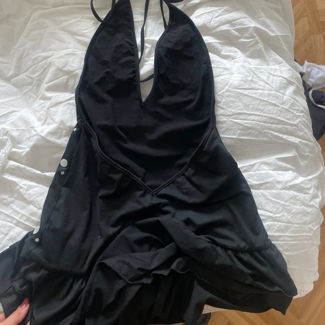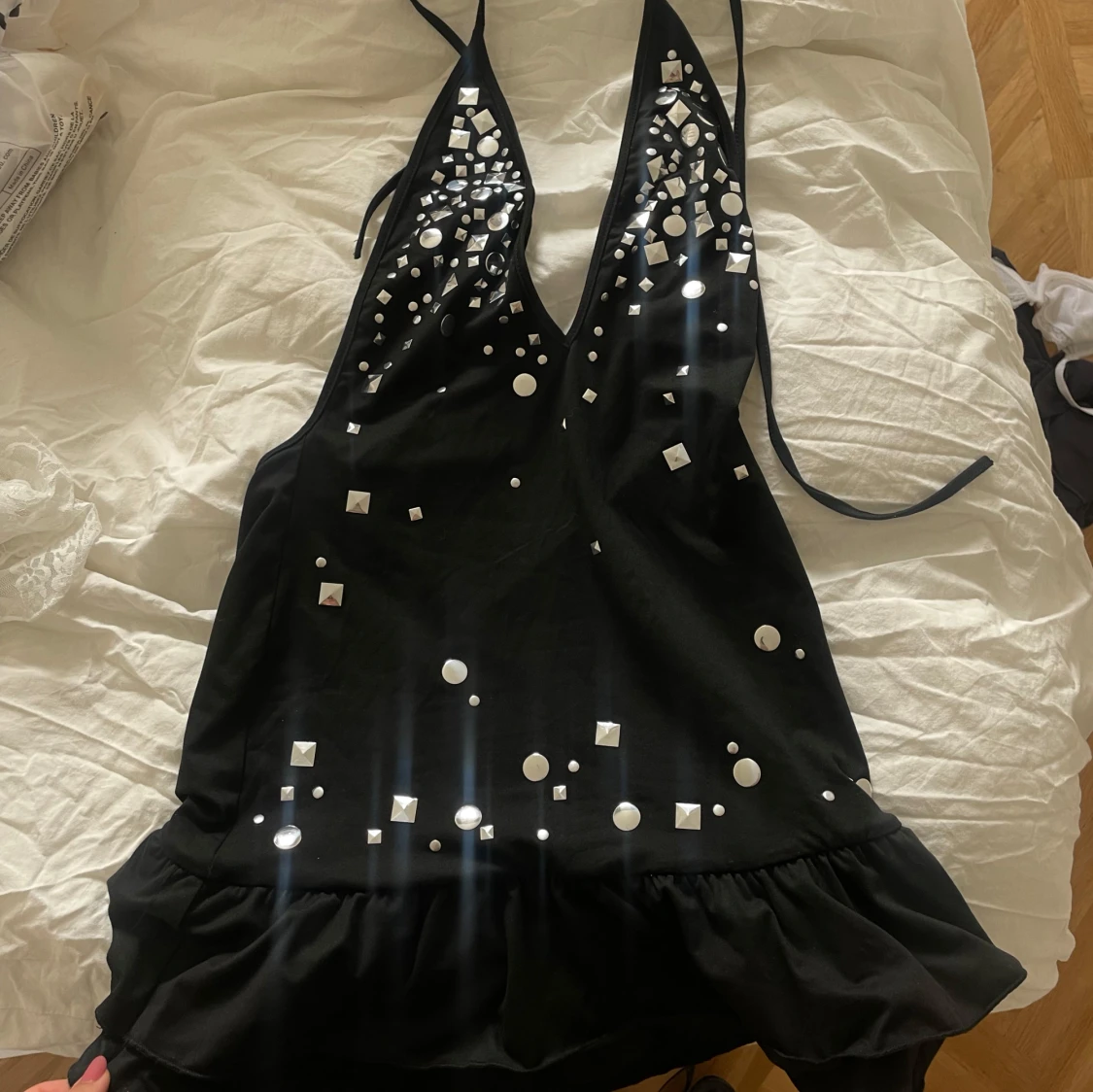 Supersnygg svart kort klänning med djup v-ringning och volang nertill. Klänningen har glittriga paljettdetaljer framtill och knytband i nacken.