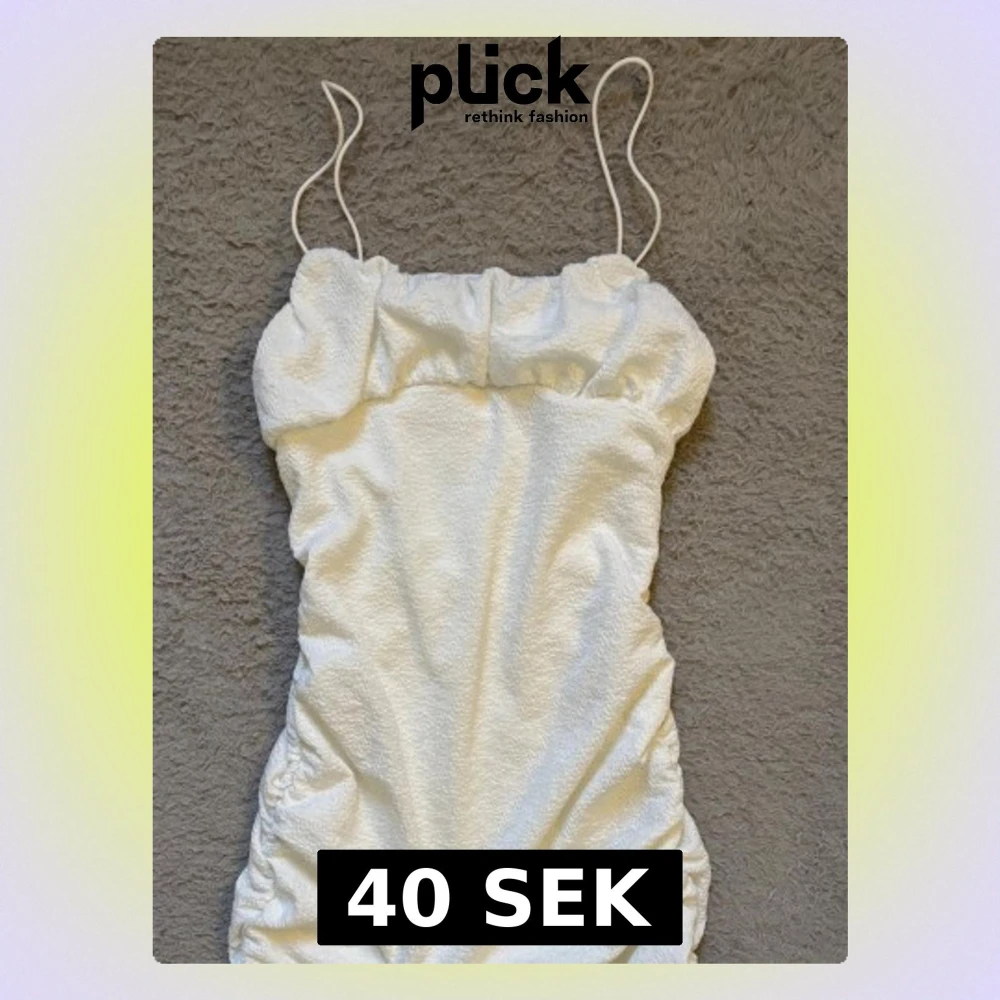 Trendig vit kortklänning med tunna axelband och rynkade sidor. Klänningen har en slät, lätt glansig yta och figurnära passform som ger en snygg siluett. Perfekt för sommarens alla tillfällen!