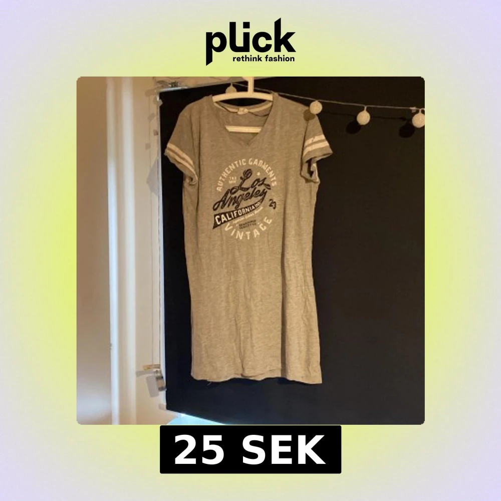 Sportig grå t-shirtklänning från Female Passion med tryck 'Los Angeles California Vintage' framtill. Kort ärm med vita ränder, v-ringad hals och avslappnad passform. Perfekt för chill dagar eller när du vill ha en casual look.