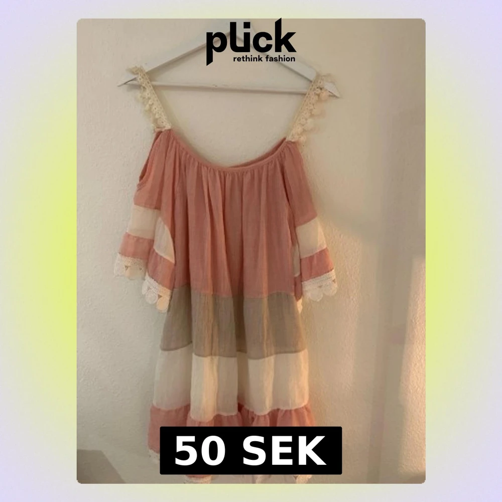 En rosa, vit och beige randig strandklänning. Väldigt lätt och luftig. Storlek S/M. Liten gul missfärgning vid axelbanden.