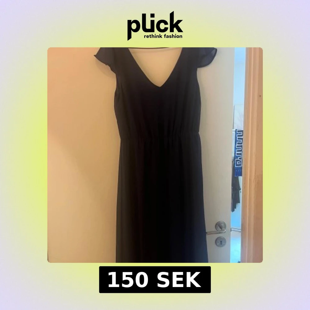 Snygg marinblå långklänning med djup v-ringning och korta ärmar. Klänningen har ett markerat midjeparti som ger en schysst siluett. Materialet känns lätt och flowy, perfekt för dig som gillar stilrena och enkla plagg med lite extra elegans. Helt oanvänd.