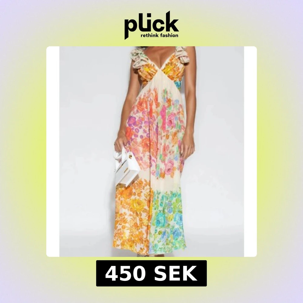Superfin långklänning från Mior Paris med färgglatt blommönster i orange, rosa, blått och grönt på ljus botten. Klänningen har volangärmar, v-ringning, öppen rygg och knyt i ryggen. Aldrig använd med lappen kvar!!!