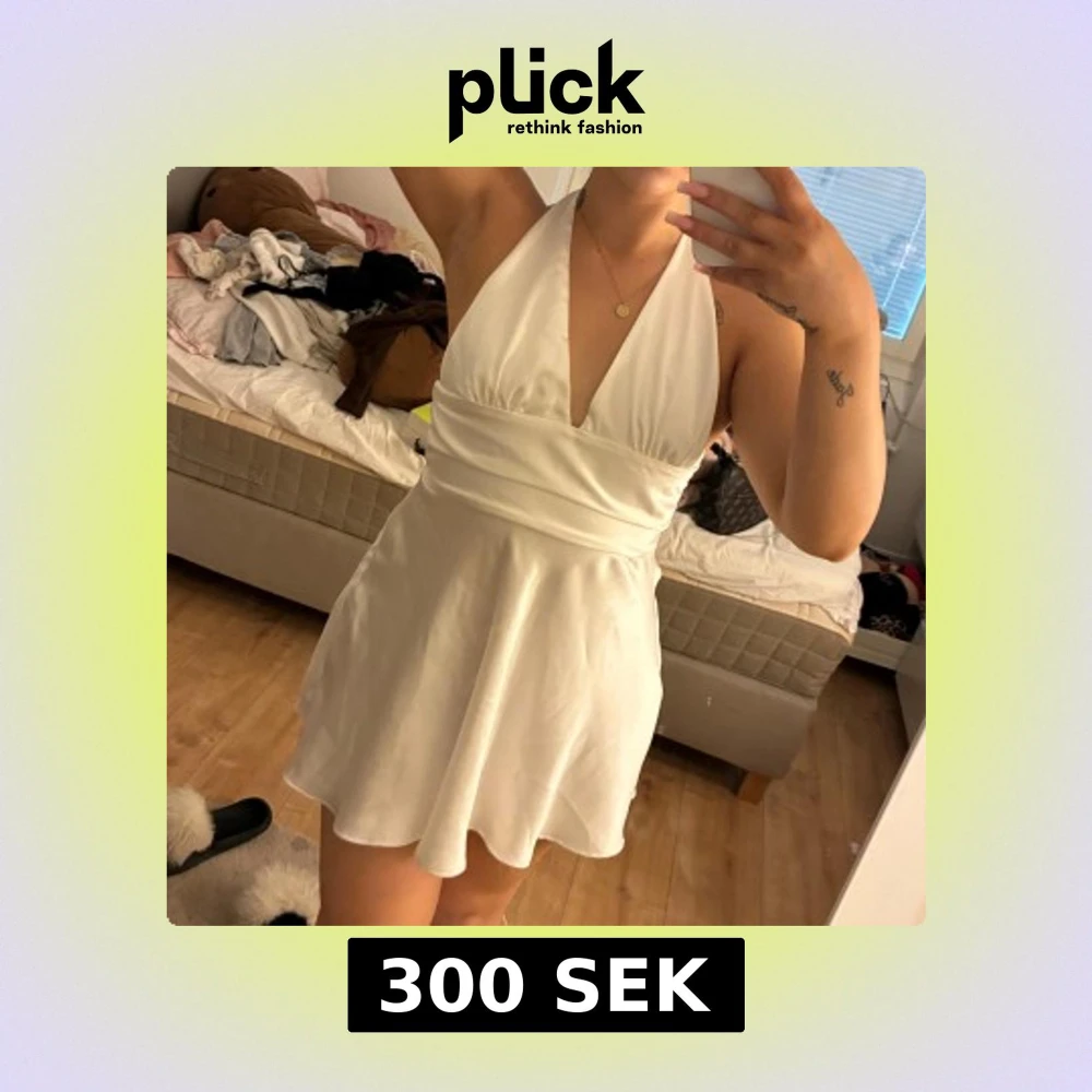 Supersöt vit kortklänning med omlott och stor rosett i ryggen. Klänningen har halterneck, v-ringad front och öppen rygg. Materialet är i silke, lätt och flowy, perfekt för varma dagar. Snygg och enkel design som ger en fräsch och ungdomlig vibe.