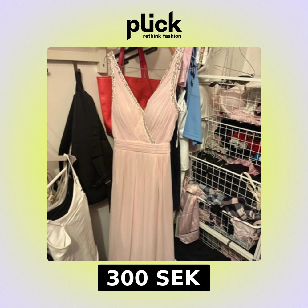 Säljer en ljusrosa långklänning med djup v-ringning och glittriga stenar längs kanterna. Klänningen har öppen rygg med dekorativa band och ett elegant fall. Perfekt för bal eller fest! 💖lite fläckar men inget som syns vid användning. Märket cotton club