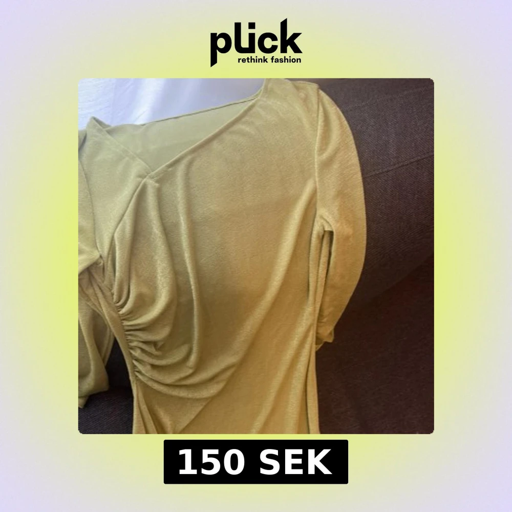 Säljer en ljusgrön klänning med omlottdesign och lätt glansigt material. Klänningen har lång ärm och snygga rynkade detaljer längs sidan. Och slit. Perfekt för dig som vill ha något stilrent men ändå unikt. Den är lite stretchig. Använd 1 gång