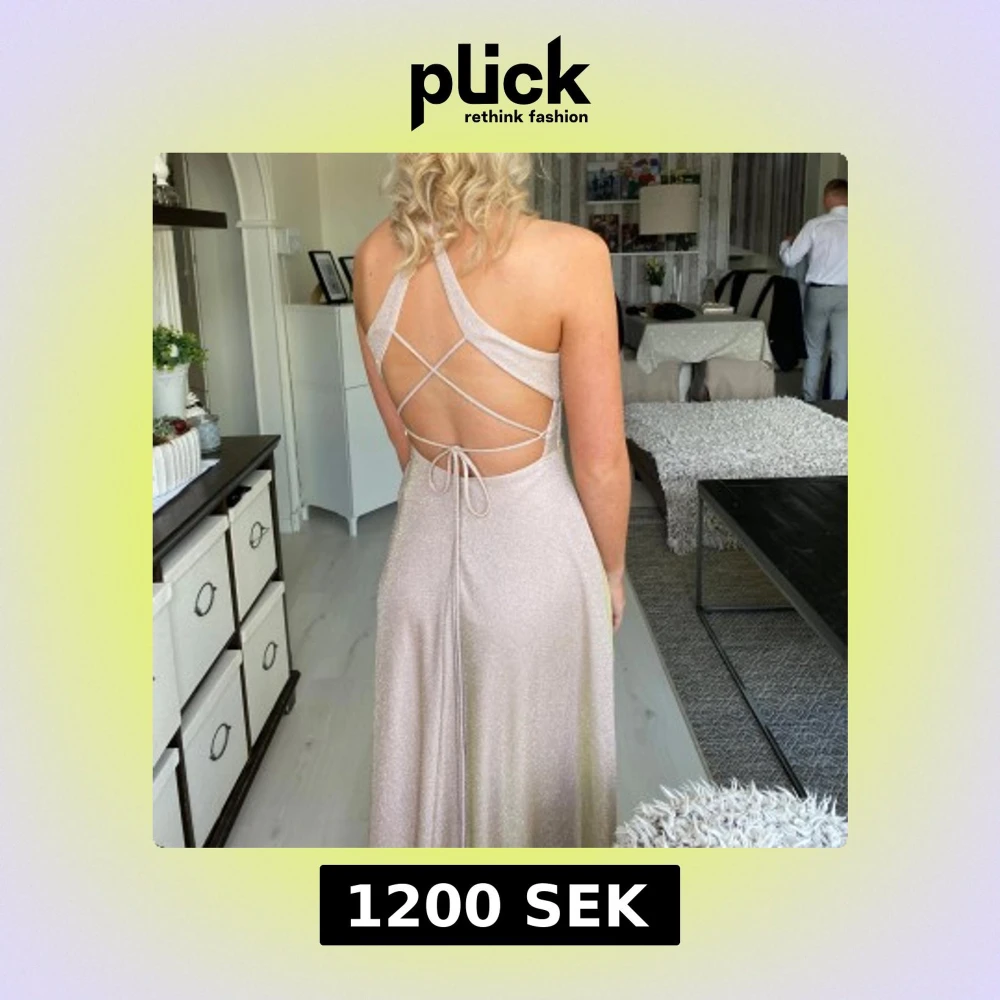Säljer en elegant ljusglittrig långklänning med halterneck och snygga korsade band i ryggen. Klänningen har en figurnära passform upptill och faller fint ner mot golvet. Passar både xs och s och endast använd en gång