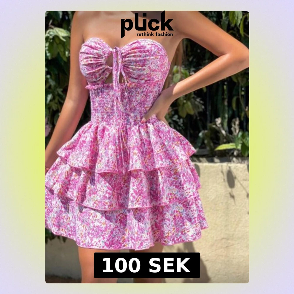 Supersöt kort klänning i rosa och vitt med blommigt mönster och volanger. Axelbandslös modell med smockad midja och knyt framtill. Perfekt för soliga dagar och picknickar. Lätt och luftig känsla.
