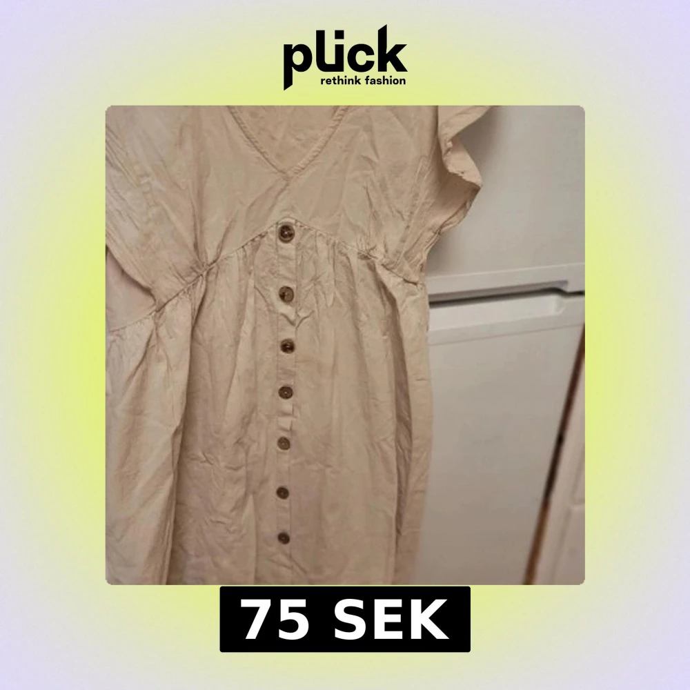 Charmig beige klänning med v-ringning och knappar framtill. Den har en luftig passform och korta ärmar, perfekt för varmare dagar. Klänningen har en avslappnad stil med en lätt rynkad design under bysten.