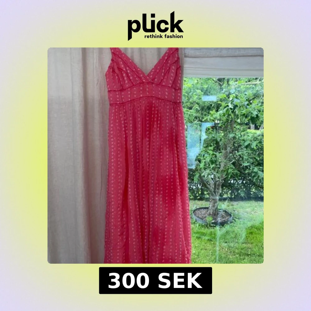 Söt rosa långklänning med vita geometriska mönster och tunna axelband. Klänningen har omlott-v-ringning och fina spetsdetaljer vid midjan. Tyget är lätt och luftigt, perfekt för varma dagar. Passformen är lös och flowy för en avslappnad vibe.
