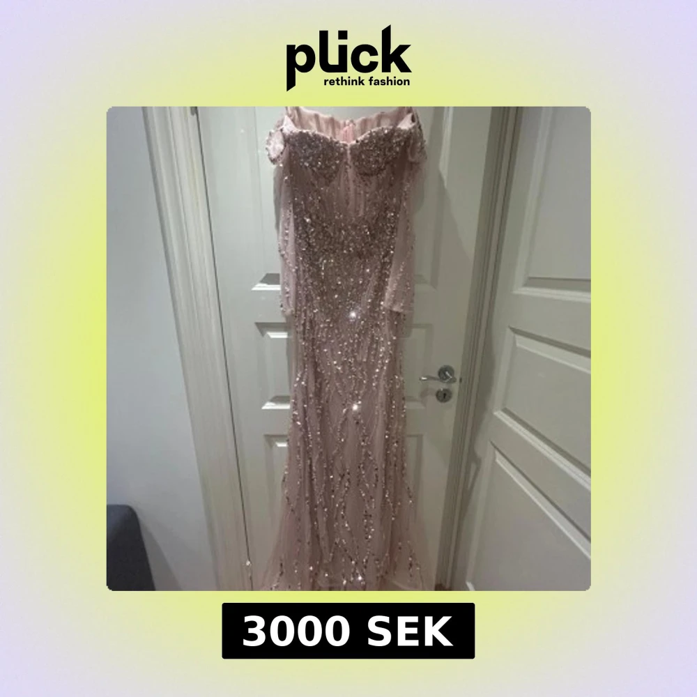 Superfin ljusrosa långklänning med massor av paljetter och glittriga detaljer. Klänningen är axelbandslös med figurnära passform och har dragkedja i ryggen. Perfekt för bal eller fest, ger en riktigt lyxig känsla och sticker ut med sitt skimrande tyg.