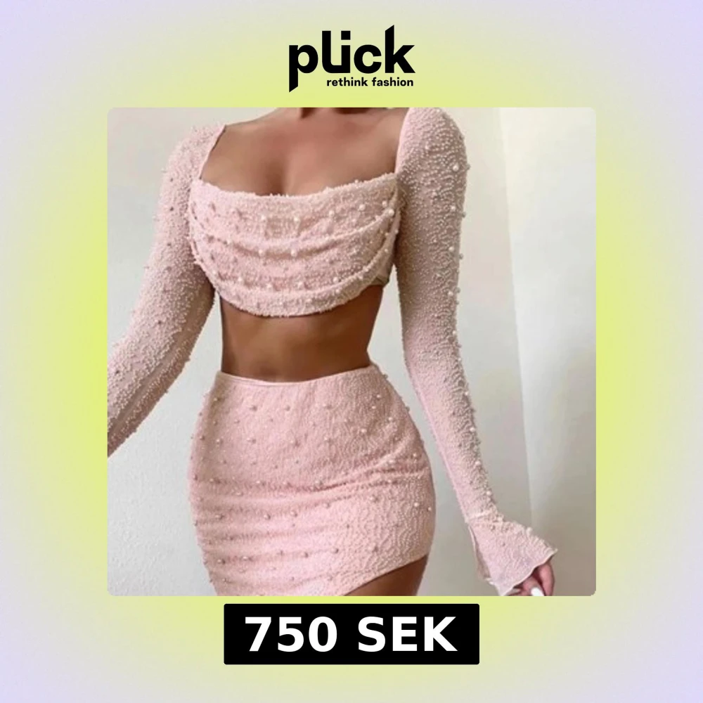 Elegant rosa kjol och top från Oh polly med pärlbeströdd design. Den har en croppad topp med långa ärmar och en tight passform. Kjolen är lång med en slits som ger en sofistikerad look.