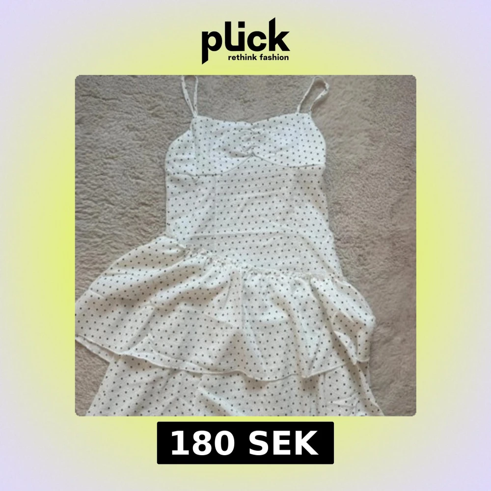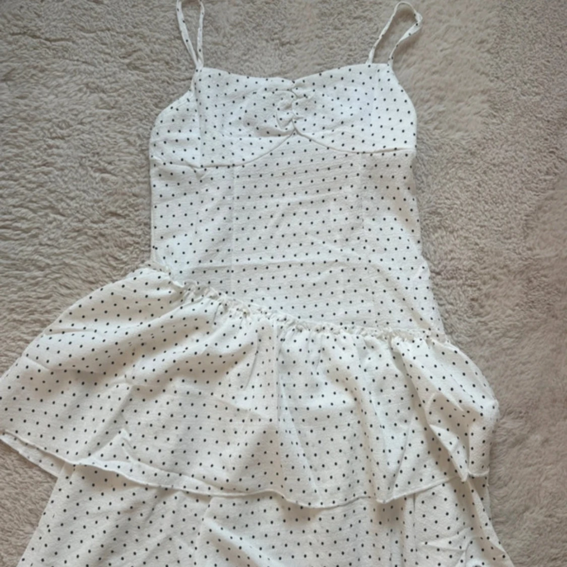Supersöt vit kortklänning med svarta prickar och volang nertill. Klänningen har smala axelband och en feminin passform, perfekt för varma dagar. Lätt och luftig, med en söt detalj framtill vid bysten.