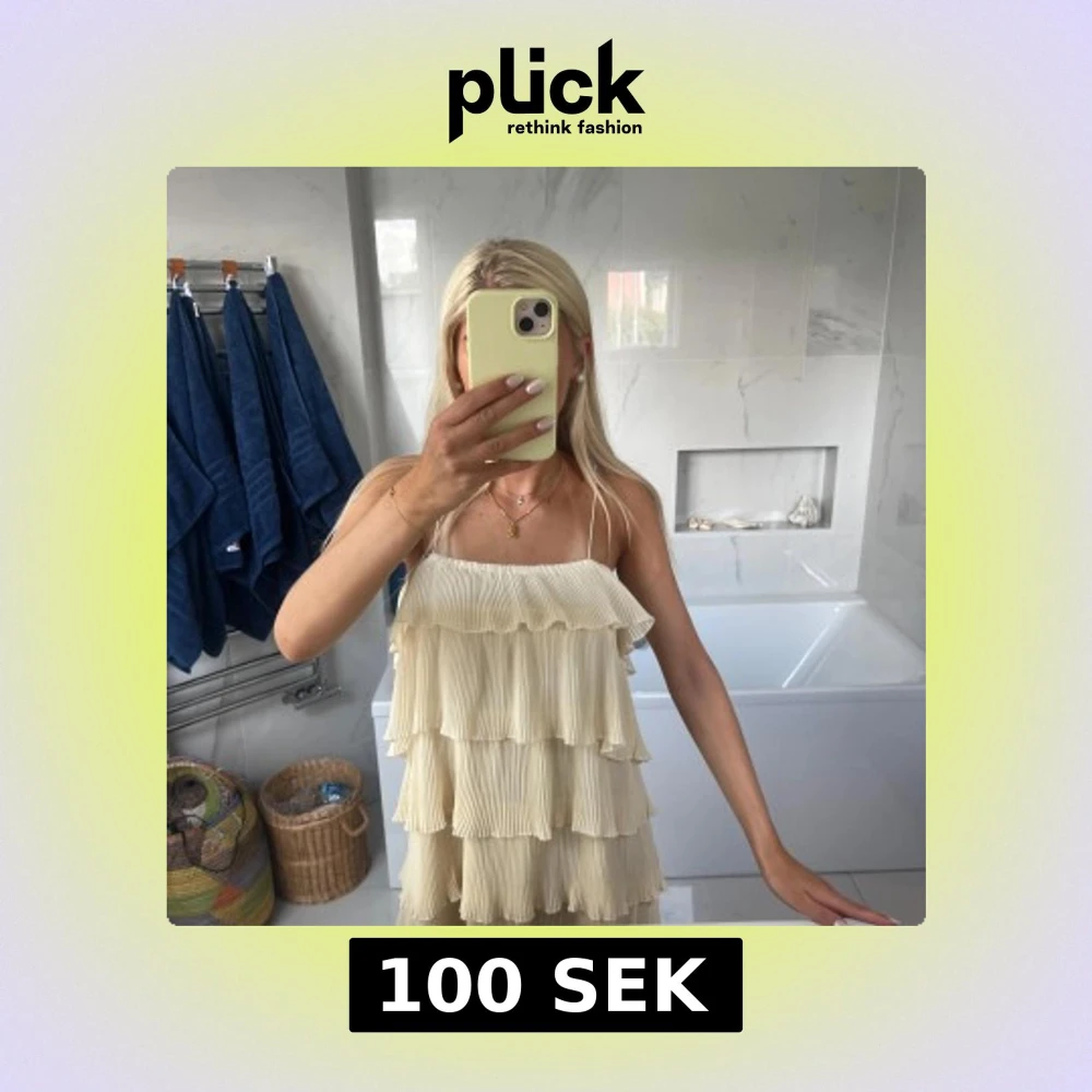 Supersöt kort klänning med tunna axelband och flera lager plisserade volanger. Ljusbeige färg som ger en fräsch och somrig vibe. Perfekt för varma dagar och snygg att styla med smycken. Materialet känns lätt och luftigt.