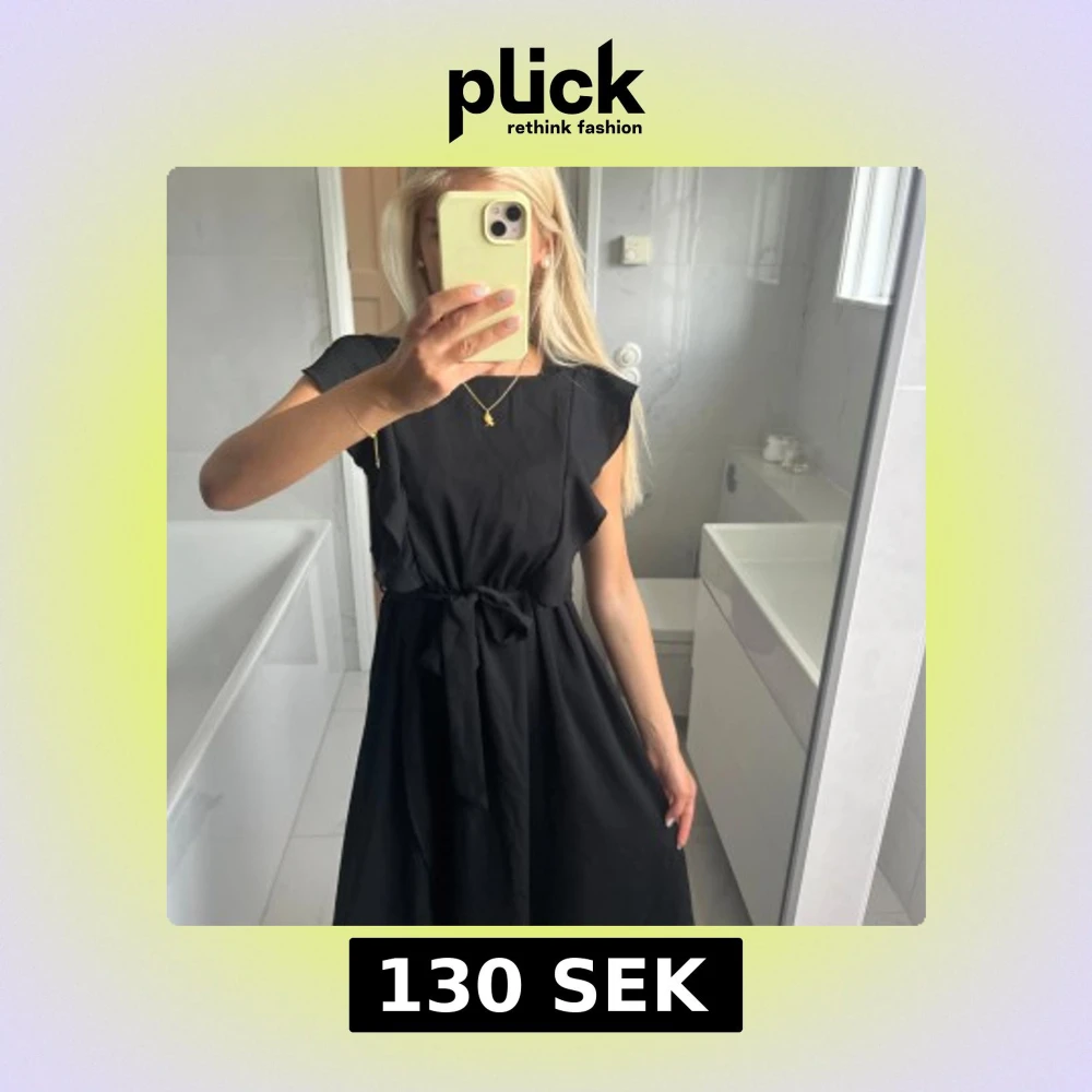 Snygg svart klänning med korta ärmar och volangdetaljer längs sidorna. Knytband i midjan som ger en fin siluett. Perfekt för dig som gillar en enkel men stilren look. Klänningen har rund halsringning och är lätt utsvängd nertill.