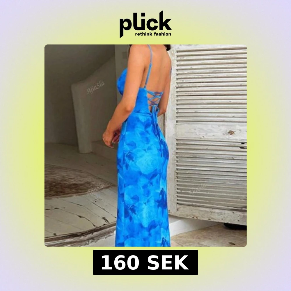 Snygg långklänning i blått med blommigt mönster och tunna axelband. Klänningen har en figurnära passform och öppen rygg med snörningsdetalj. Perfekt för sommarens alla tillfällen när du vill sticka ut lite extra.