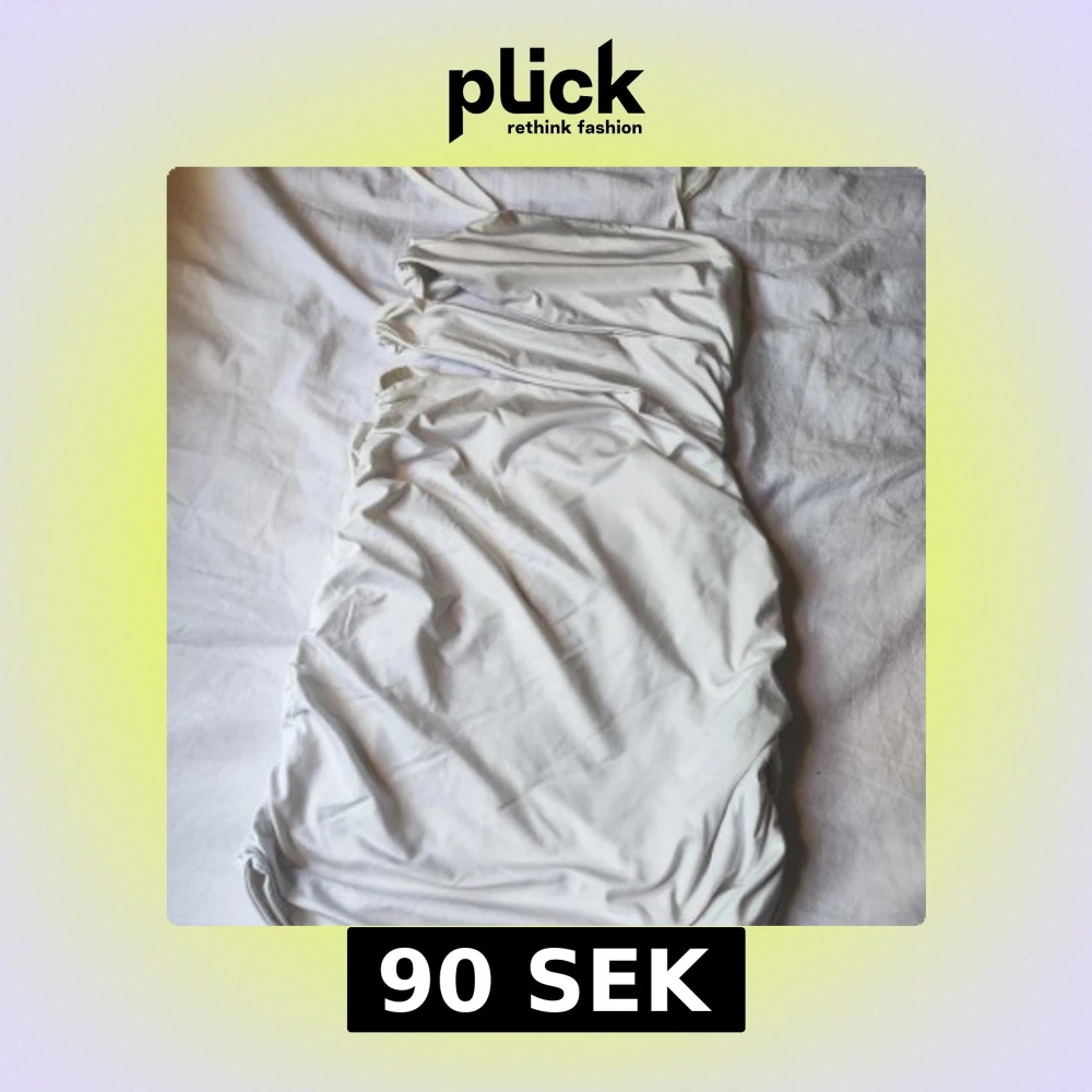 Säljer en vit kortklänning med smala axelband och snygga draperade detaljer längs sidorna. Klänningen har omlott-design och är tillverkad i ett mjukt, stretchigt material som sitter skönt mot kroppen. Perfekt för dig som gillar minimalistisk och stilren look.