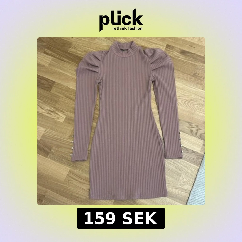 Superfin ribbad lila klänning med puffärmar och höga ärmslut med dekorativa knappar. Klänningen har en tight passform, hög hals och är tillverkad i ett stretchigt material som sitter snyggt på kroppen. Perfekt för dig som gillar trendiga detaljer och stilren look.