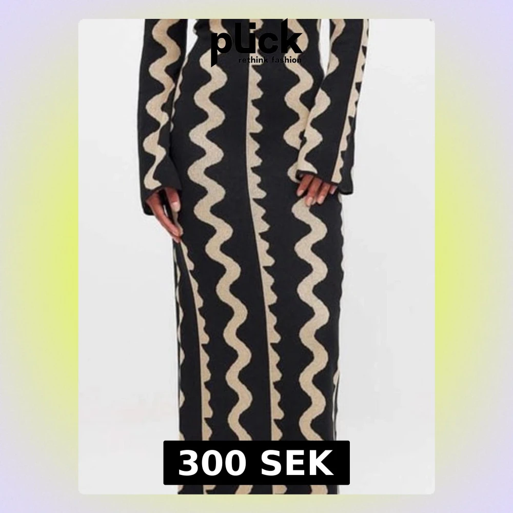 Cool svart långklänning med beige vågiga ränder och lång ärm. Klänningen har en figurnära passform och är tillverkad i ett mjukt stickat material som känns både trendigt och bekvämt.