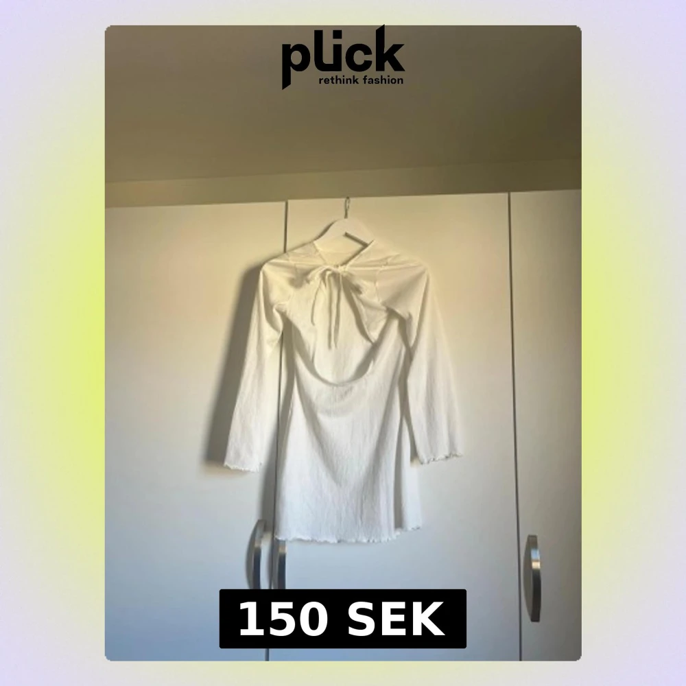 Supersöt vit kortklänning med långa ärmar och knyt fram i halsen. Klänningen har en lätt ribbad struktur och vågiga kanter vid ärmslut och nederkant. Perfekt för dig som gillar minimalistisk och stilren look.